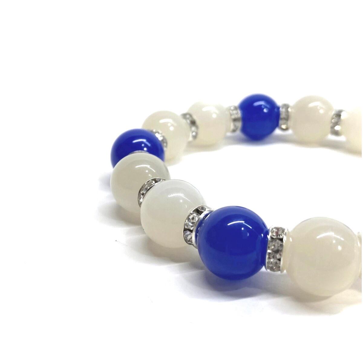こちらは、ムーンストーンと青瑪瑙を組み合わせたパワーストーンブレスレットです。間にはロンデルを挟み高級感あるデザインに仕上げております。石大きさは12mm玉を使用して内周 約18cmです。気になる方は是非この機会にどうぞ。