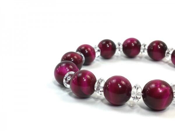 こちらは、ピンクタイガーアイを使用したブレスレットです。間には水晶ソロバンが挟まれてアクセントとなっております。石大きさは腕にも馴染みやすいように12mm玉で内周約17cm(伸可能)です。cmです。気になる方は是非この機会にどうぞ。