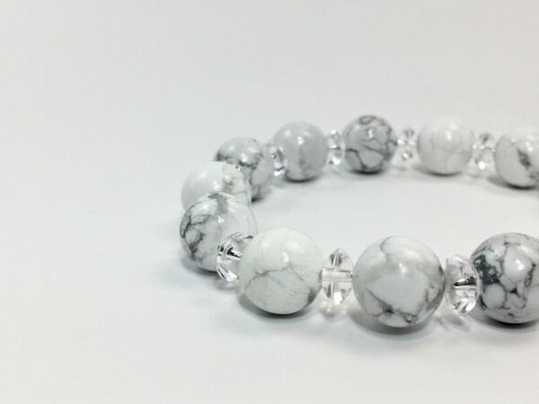 こちらは、ハウライトを使用したブレスレットです。間には水晶ソロバンが挟まれてアクセントとなっております。石大きさは腕にも馴染みやすいように12mm玉で内周約17cm(伸可能)です。気になる方は是非この機会にどうぞ。
