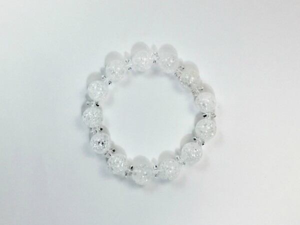 こちらは、クラック水晶を使用したブレスレットです。間には水晶ソロバンが挟まれてアクセントとなっております。石大きさは腕にも馴染みやすいように12mm玉で内周約17cm(伸可能)です。気になる方は是非この機会にどうぞ。