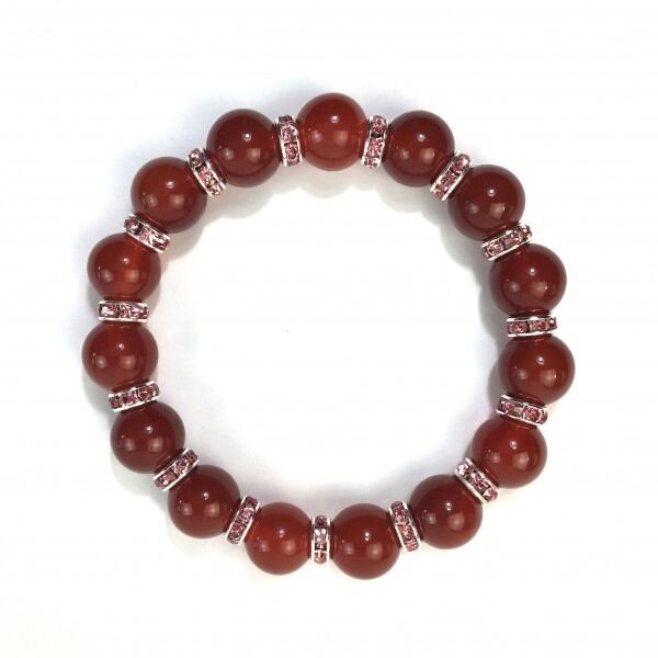 こちらは、12mm玉の赤瑪瑙を使用した天然石ブレスレットです。石との間にはロンデルを挟み高級感を演出しています。シンプルなデザインですのでどんなコーディネートとも合わせ易いブレスレットです。石大きさは12mm玉です。。内周約18cmです。気になる方は是非この機会にどうぞ。