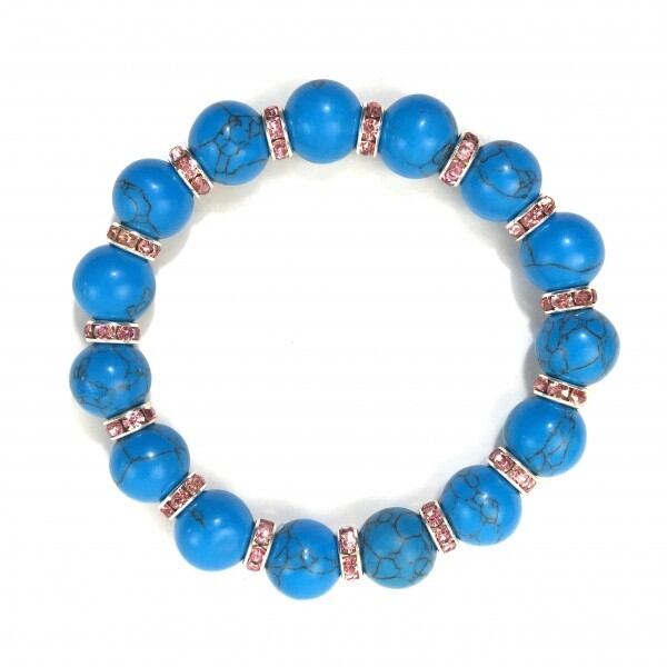 こちらは、12mm玉のターコイズを使用したブレスレットです。石との間にはロンデルを挟み高級感を演出しています。シンプルなデザインですのでどんなコーディネートとも合わせ易いブレスレットです。石大きさは12mm玉です。内周約18cmです。気になる方は是非この機会にどうぞ。