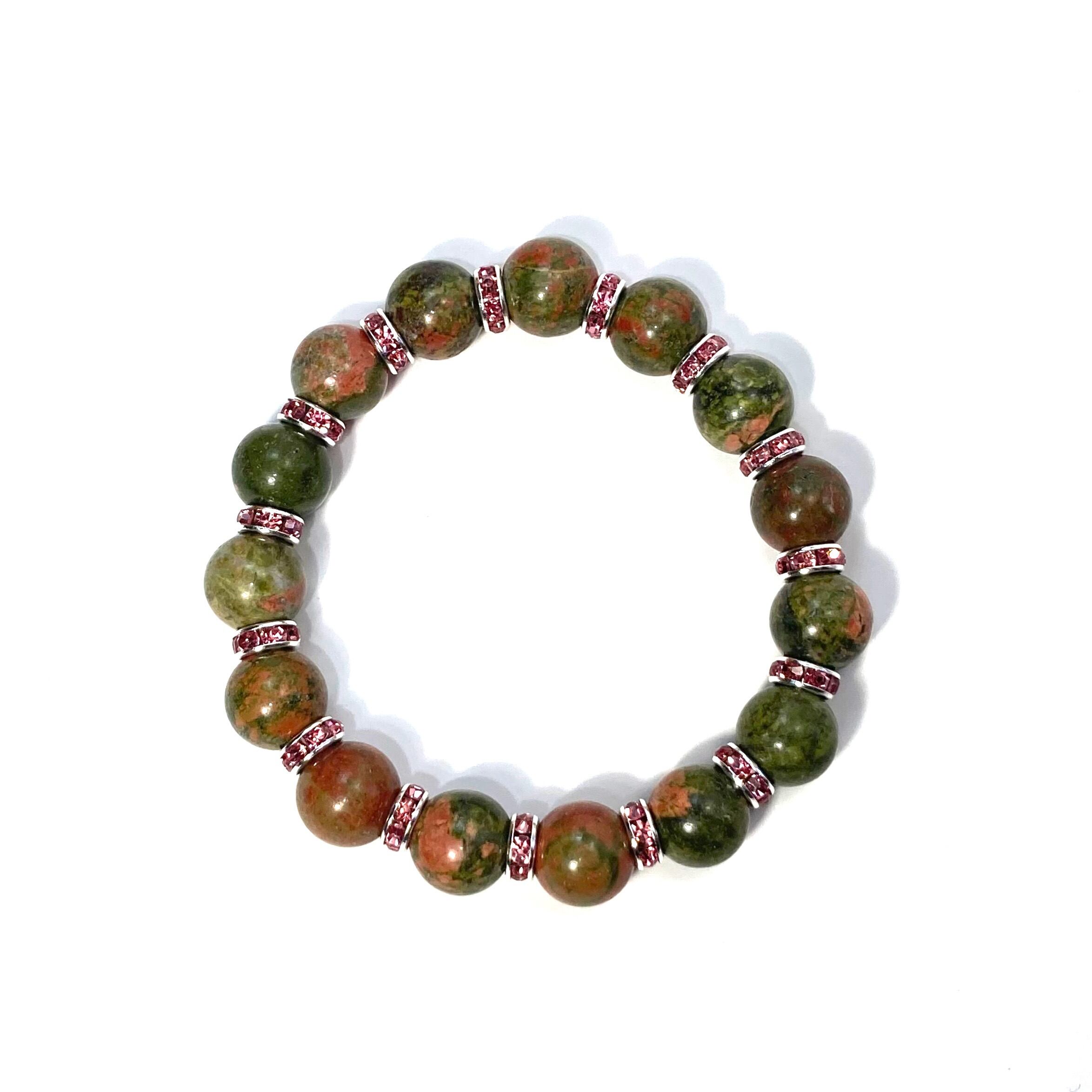 こちらは、12mm玉のユナカイトを使用した天然石ブレスレットです。石との間にはロンデルを挟み高級感を演出しています。シンプルなデザインですのでどんなコーディネートとも合わせ易いブレスレットです。石大きさは12mm玉です。内周約18cmです。気になる方は是非この機会にどうぞ。