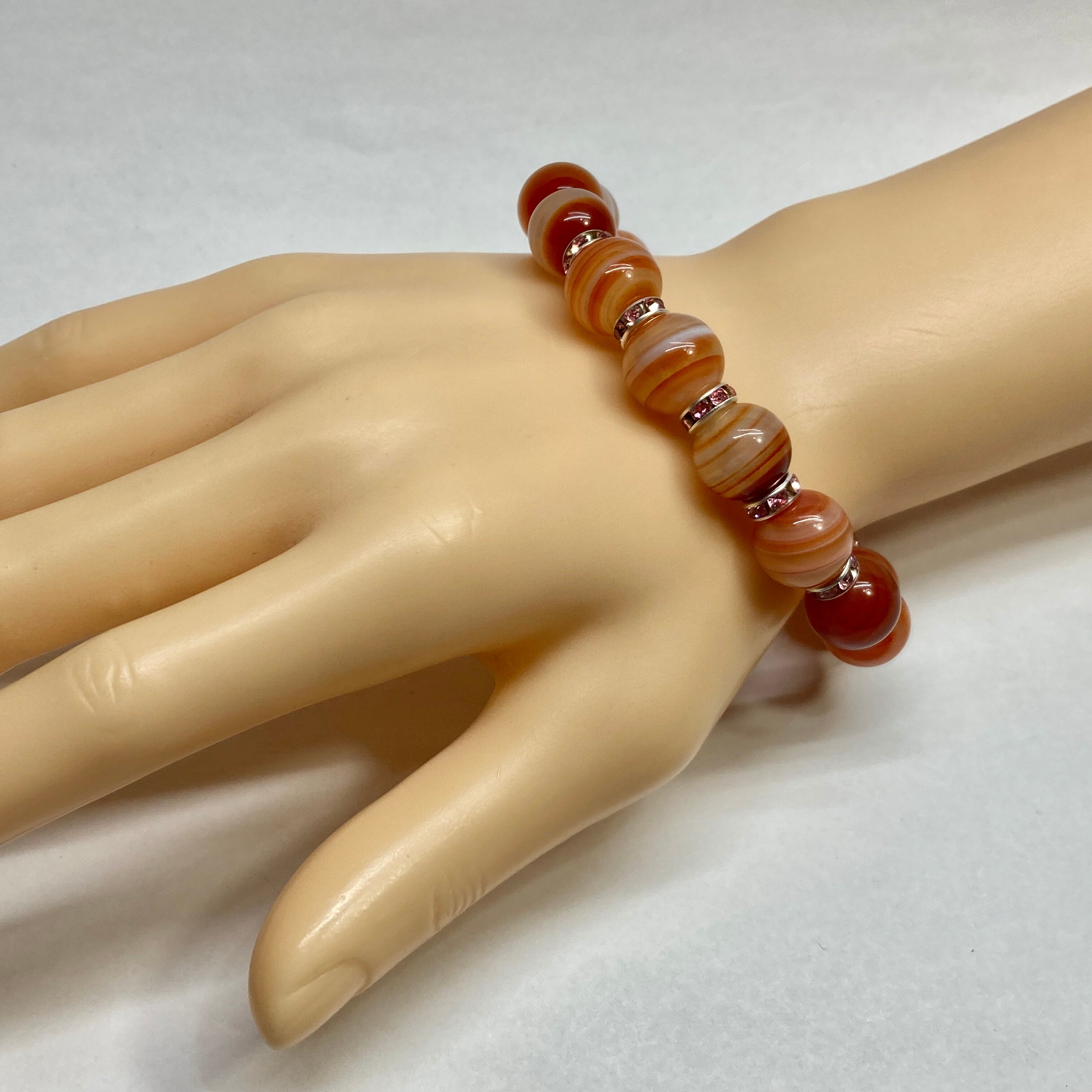 こちらは、12mm玉のカーネリアン・サードニクス(サードオニキス) を使用したパワーストーンブレスレットです。間にはロンデルを挟み高級感を演出しております。男女問わずどんなコーディネートとも合わせ易いブレスレットです。サイズは内周約18cmです。 数に限りがございますので気になる方はお早めにどうぞ。