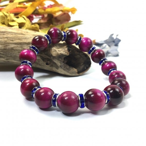 こちらは、12mm玉のピンクタイガーアイを使用したブレスレットです。石との間にはロンデルを挟み高級感を演出しています。シンプルなデザインですのでどんなコーディネートとも合わせ易いブレスレットです。石大きさは12mm玉です。内周約18cmです。気になる方は是非この機会にどうぞ。