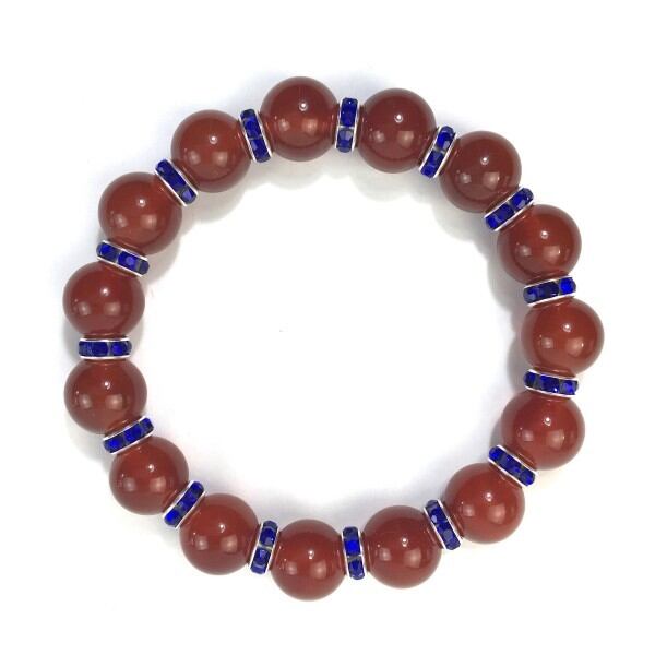 こちらは、12mm玉の赤瑪瑙を使用した天然石ブレスレットです。石との間にはロンデルを挟み高級感を演出しています。シンプルなデザインですのでどんなコーディネートとも合わせ易いブレスレットです。石大きさは12mm玉です。。内周約18cmです。気になる方は是非この機会にどうぞ。