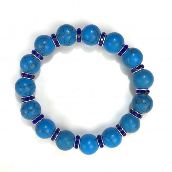 こちらは、12mm玉のターコイズを使用したブレスレットです。石との間にはロンデルを挟み高級感を演出しています。シンプルなデザインですのでどんなコーディネートとも合わせ易いブレスレットです。石大きさは12mm玉です。内周約18cmです。気になる方は是非この機会にどうぞ。