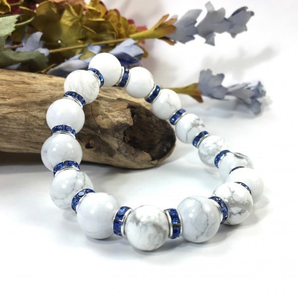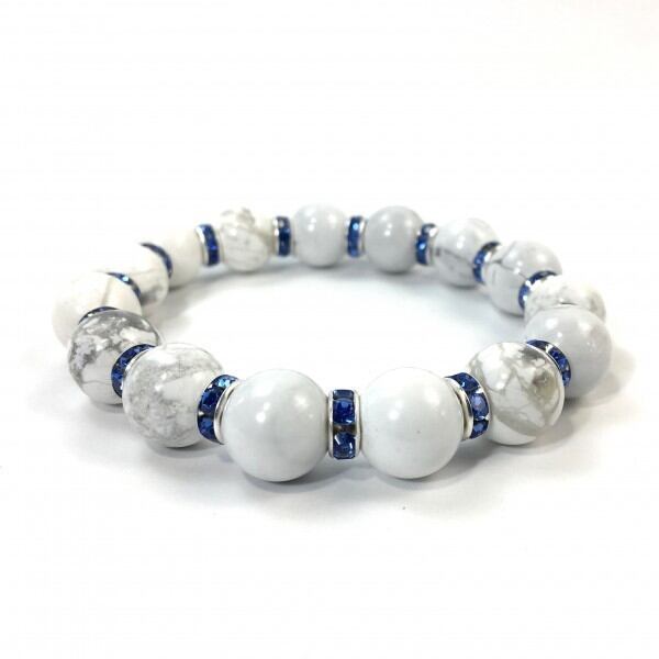 こちらは、12mm玉のハウライトを使用した天然石ブレスレットです。石との間にはロンデルを挟み高級感を演出しています。シンプルなデザインですのでどんなコーディネートとも合わせ易いブレスレットです。石大きさは12mm玉です。内周約18cmです。気になる方は是非この機会にどうぞ。