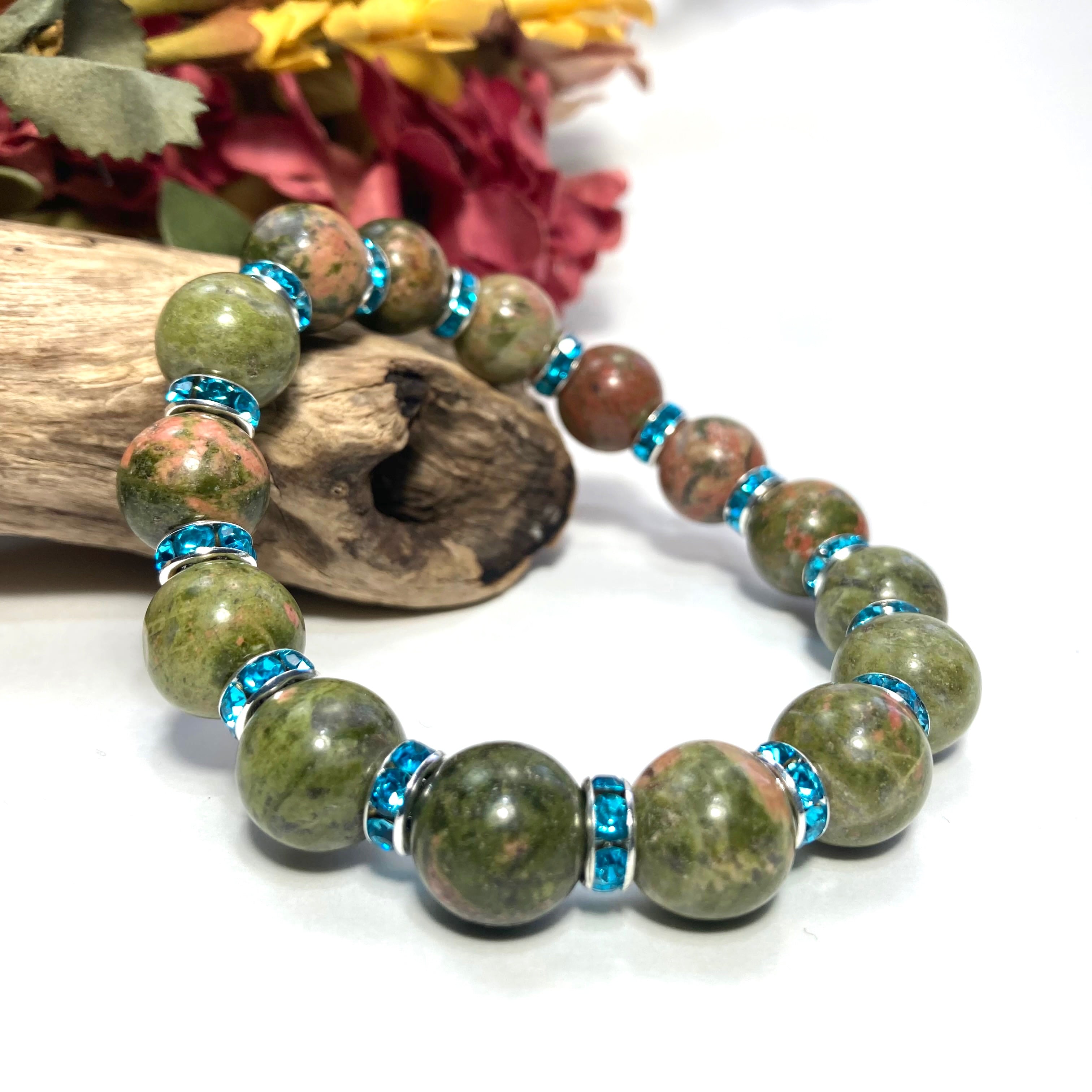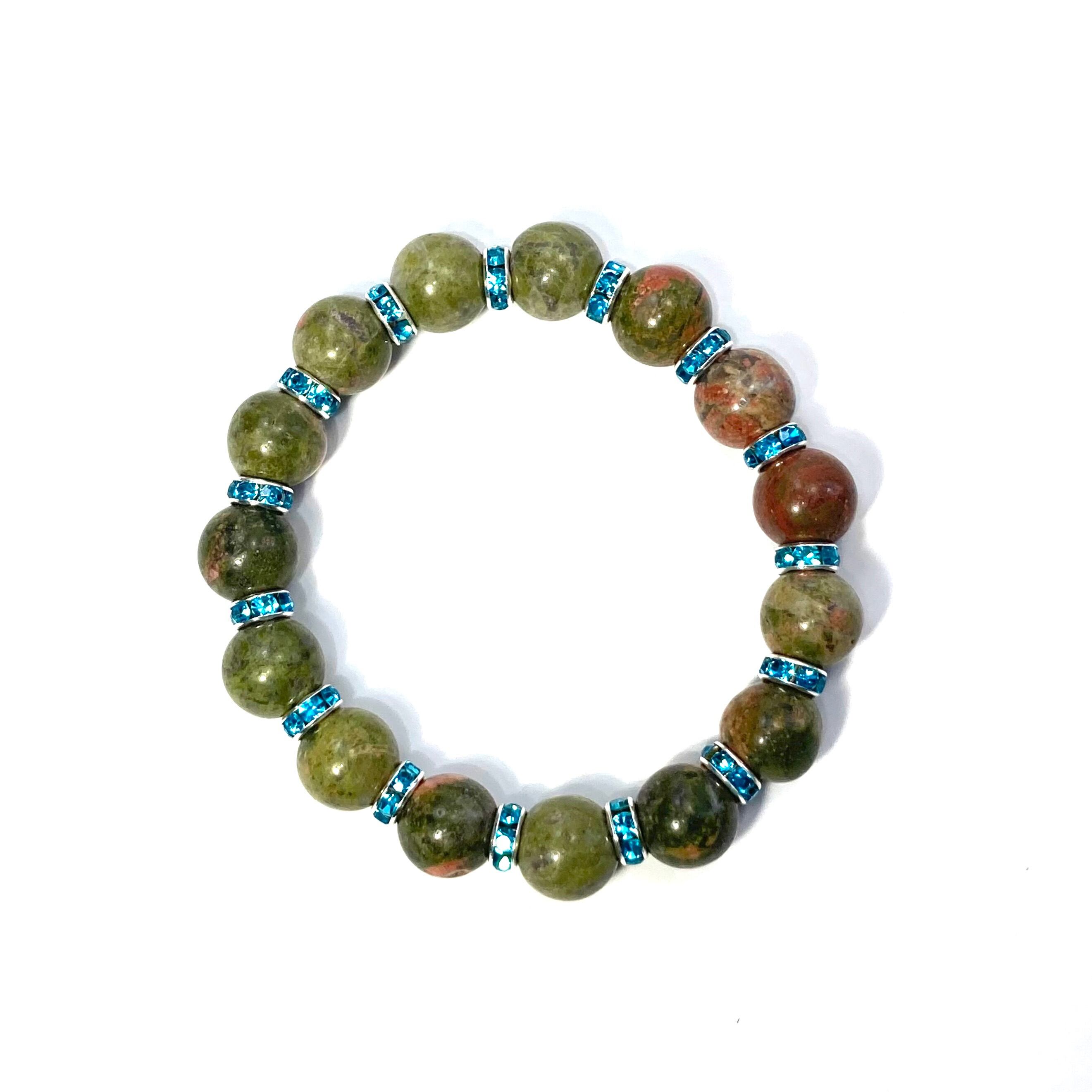 こちらは、12mm玉のユナカイトを使用した天然石ブレスレットです。石との間にはロンデルを挟み高級感を演出しています。シンプルなデザインですのでどんなコーディネートとも合わせ易いブレスレットです。石大きさは12mm玉です。内周約18cmです。気になる方は是非この機会にどうぞ。