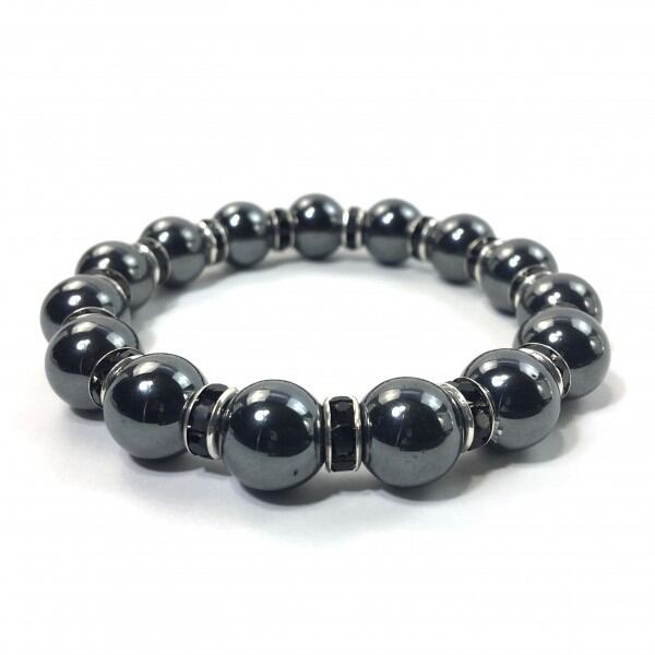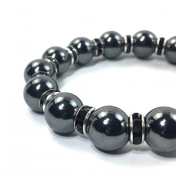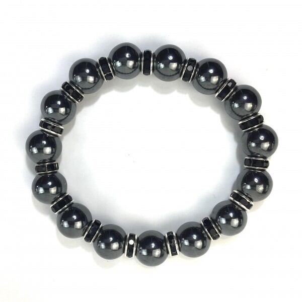 こちらは、12mm玉のヘマタイトを使用した天然石ブレスレットです。石との間にはロンデルを挟み高級感を演出しています。シンプルなデザインですのでどんなコーディネートとも合わせ易いブレスレットです。石大きさは12mm玉です。。内周約18cmです。気になる方は是非この機会にどうぞ。
