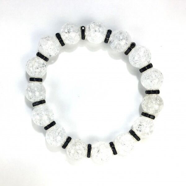 こちらは、12mm玉のクラック水晶を使用した天然石ブレスレットです。石との間にはロンデルを挟み高級感を演出しています。シンプルなデザインですのでどんなコーディネートとも合わせ易いブレスレットです。石大きさは12mm玉です。内周約18cmです。気になる方は是非この機会にどうぞ。