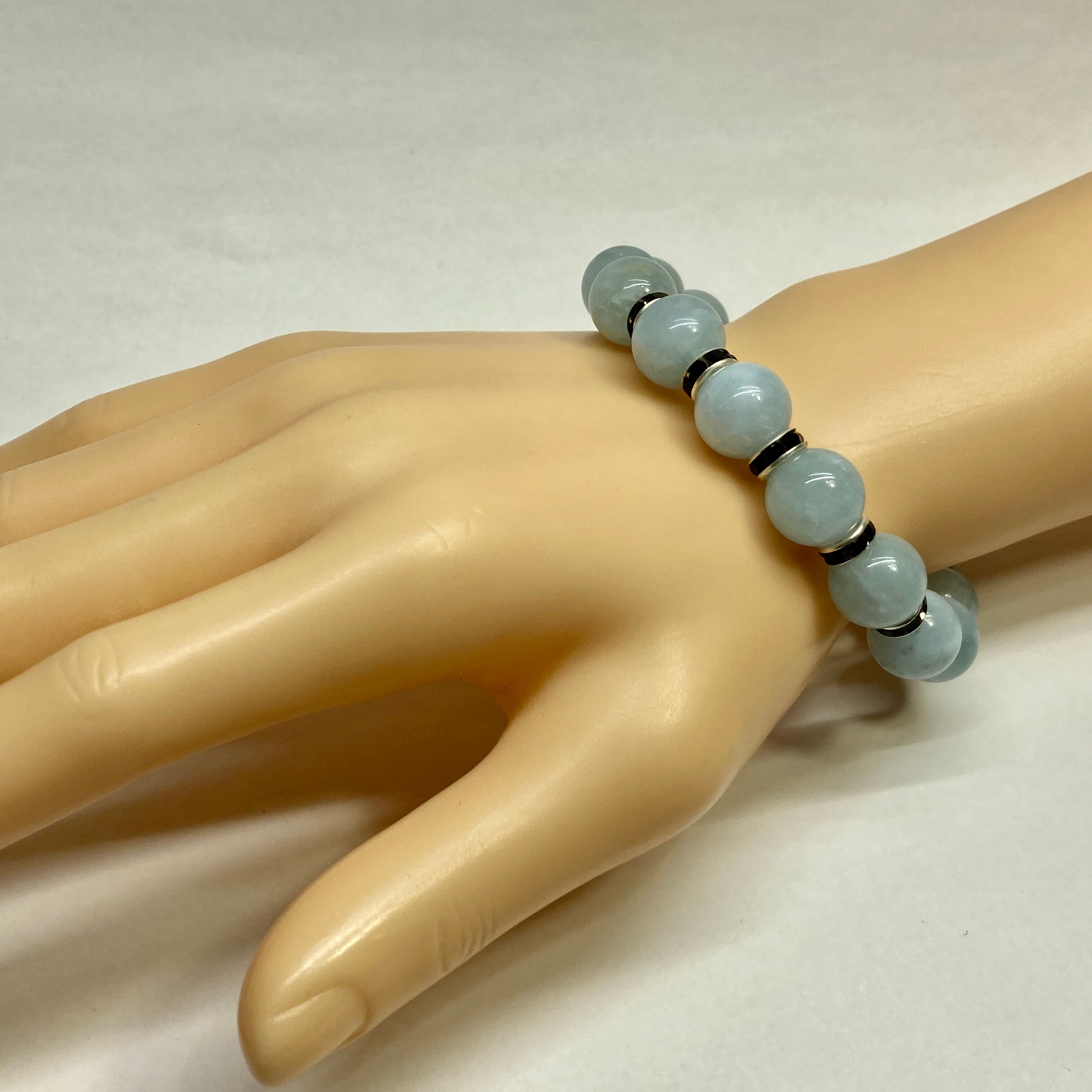 こちらは、12mm玉のアクアマリンを使用したパワーストーンブレスレットです。間にはロンデルを挟み高級感を演出しております。男女問わずどんなコーディネートとも合わせ易いブレスレットです。サイズは内周約18cmです。 数に限りがございますので気になる方はお早めにどうぞ
