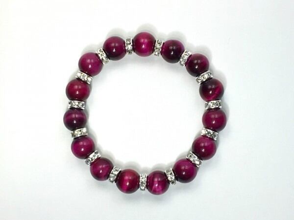 こちらは、12mm玉のピンクタイガーアイを使用したブレスレットです。石との間にはロンデルを挟み高級感を演出しています。シンプルなデザインですのでどんなコーディネートとも合わせ易いブレスレットです。石大きさは12mm玉です。内周約18cmです。気になる方は是非この機会にどうぞ。