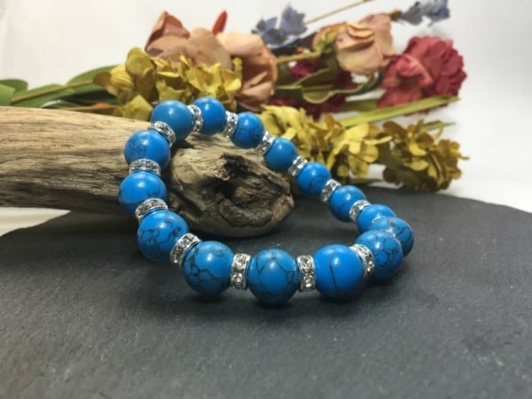 こちらは、12mm玉のターコイズを使用したブレスレットです。石との間にはロンデルを挟み高級感を演出しています。シンプルなデザインですのでどんなコーディネートとも合わせ易いブレスレットです。石大きさは12mm玉です。内周約18cmです。気になる方は是非この機会にどうぞ。