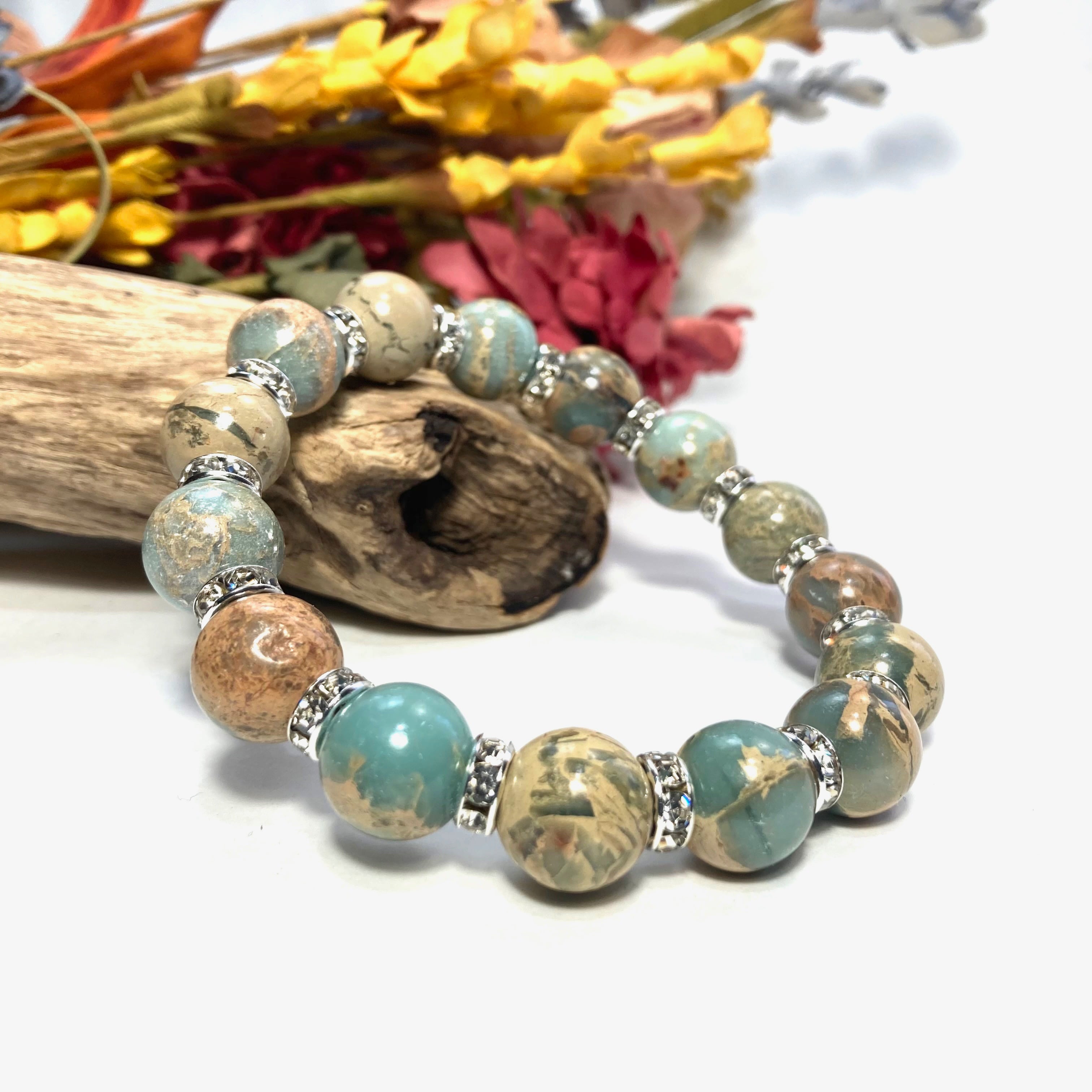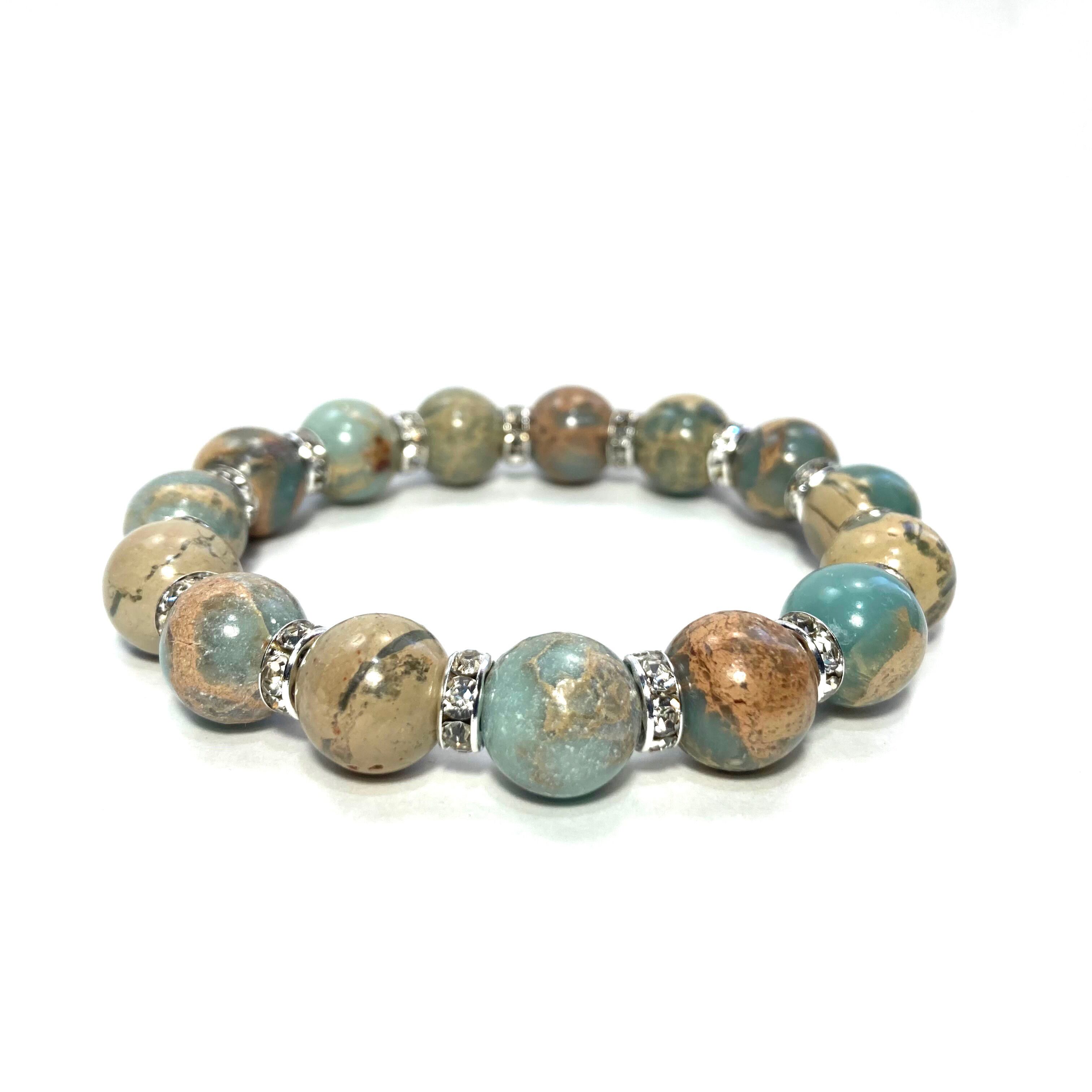 こちらは、12mm玉のインプレッションストーンを使用した天然石ブレスレットです。石との間にはロンデルを挟み高級感を演出しています。シンプルなデザインですのでどんなコーディネートとも合わせ易いブレスレットです。石大きさは12mm玉です。内周約18cmです。気になる方は是非この機会にどうぞ。