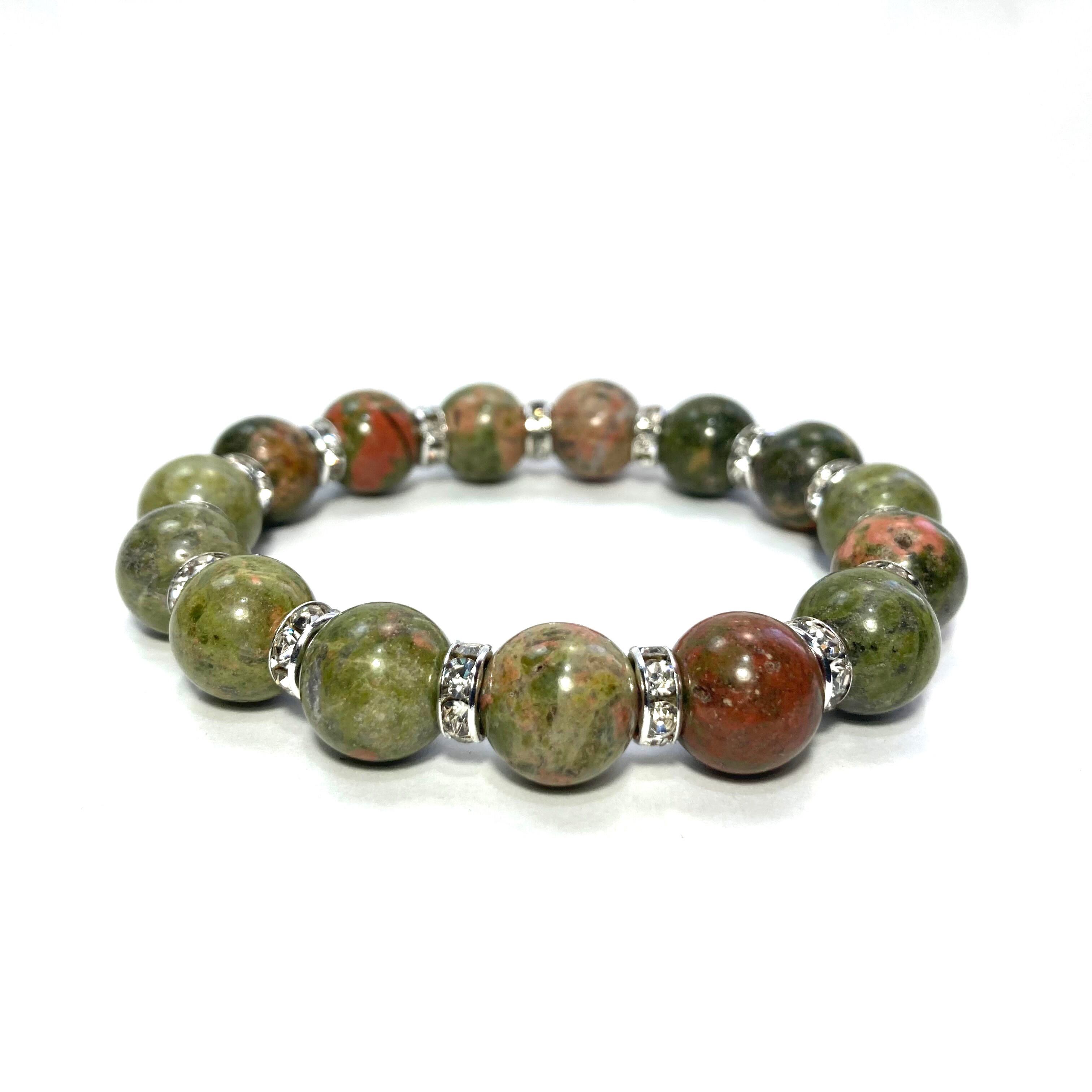 こちらは、12mm玉のユナカイトを使用した天然石ブレスレットです。石との間にはロンデルを挟み高級感を演出しています。シンプルなデザインですのでどんなコーディネートとも合わせ易いブレスレットです。石大きさは12mm玉です。内周約18cmです。気になる方は是非この機会にどうぞ。