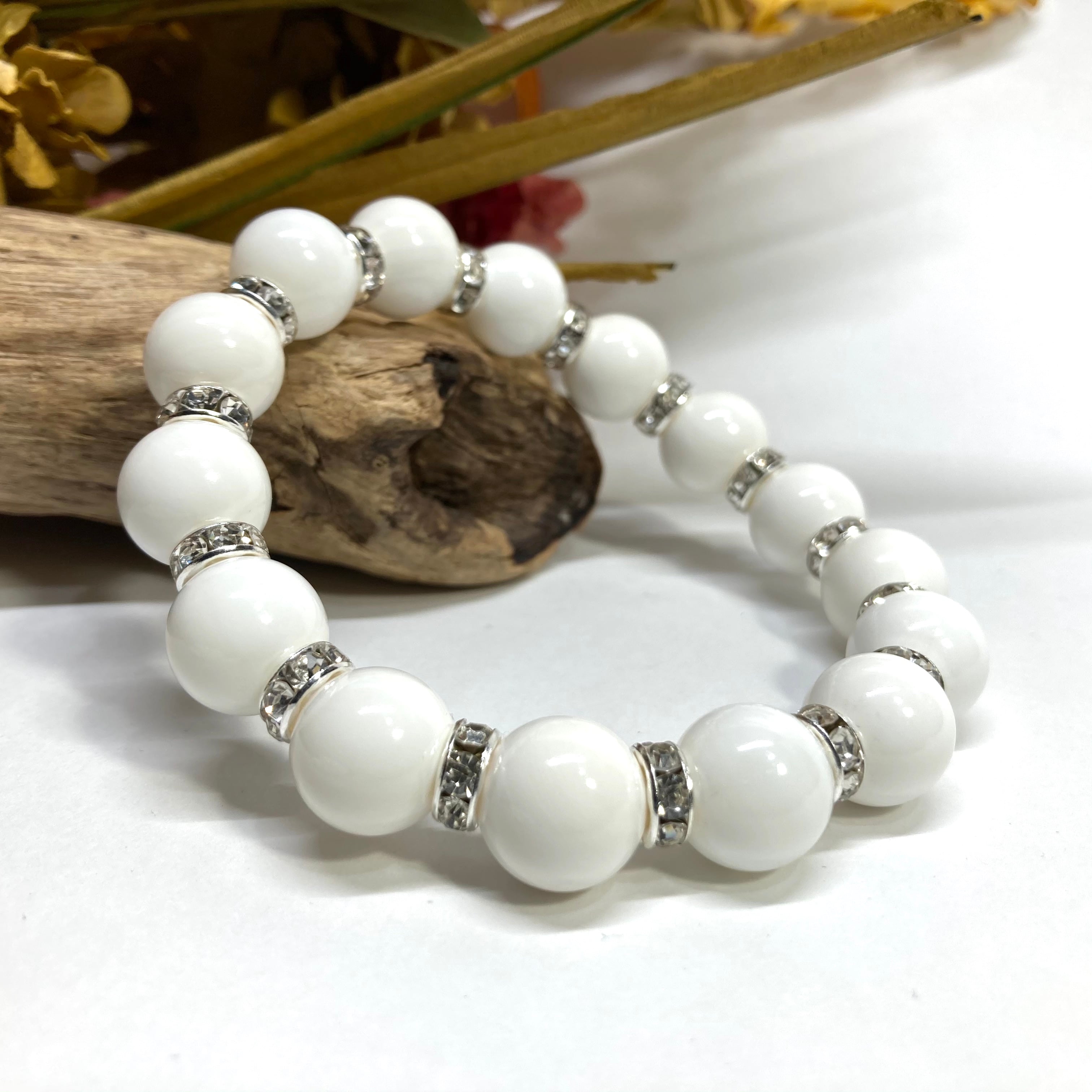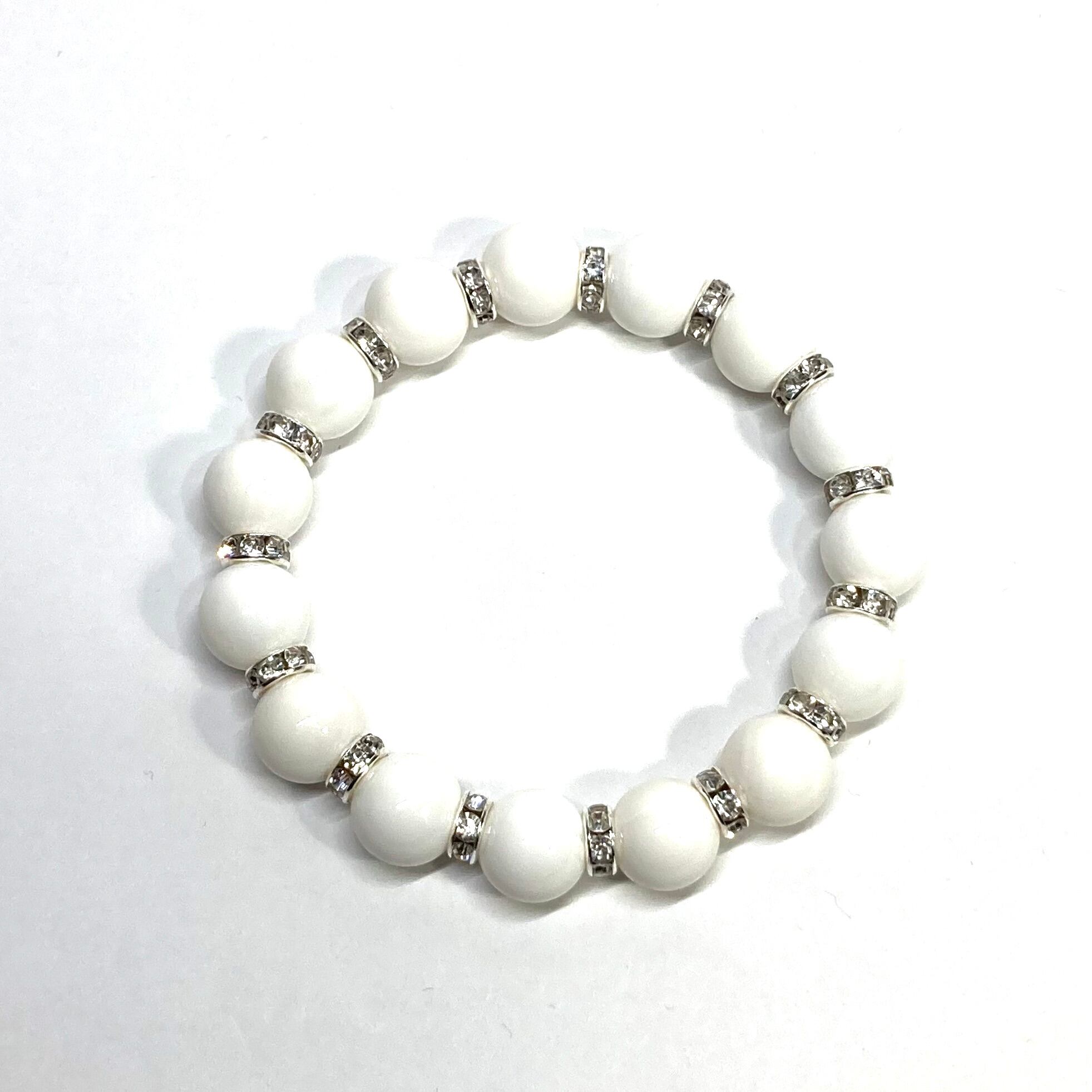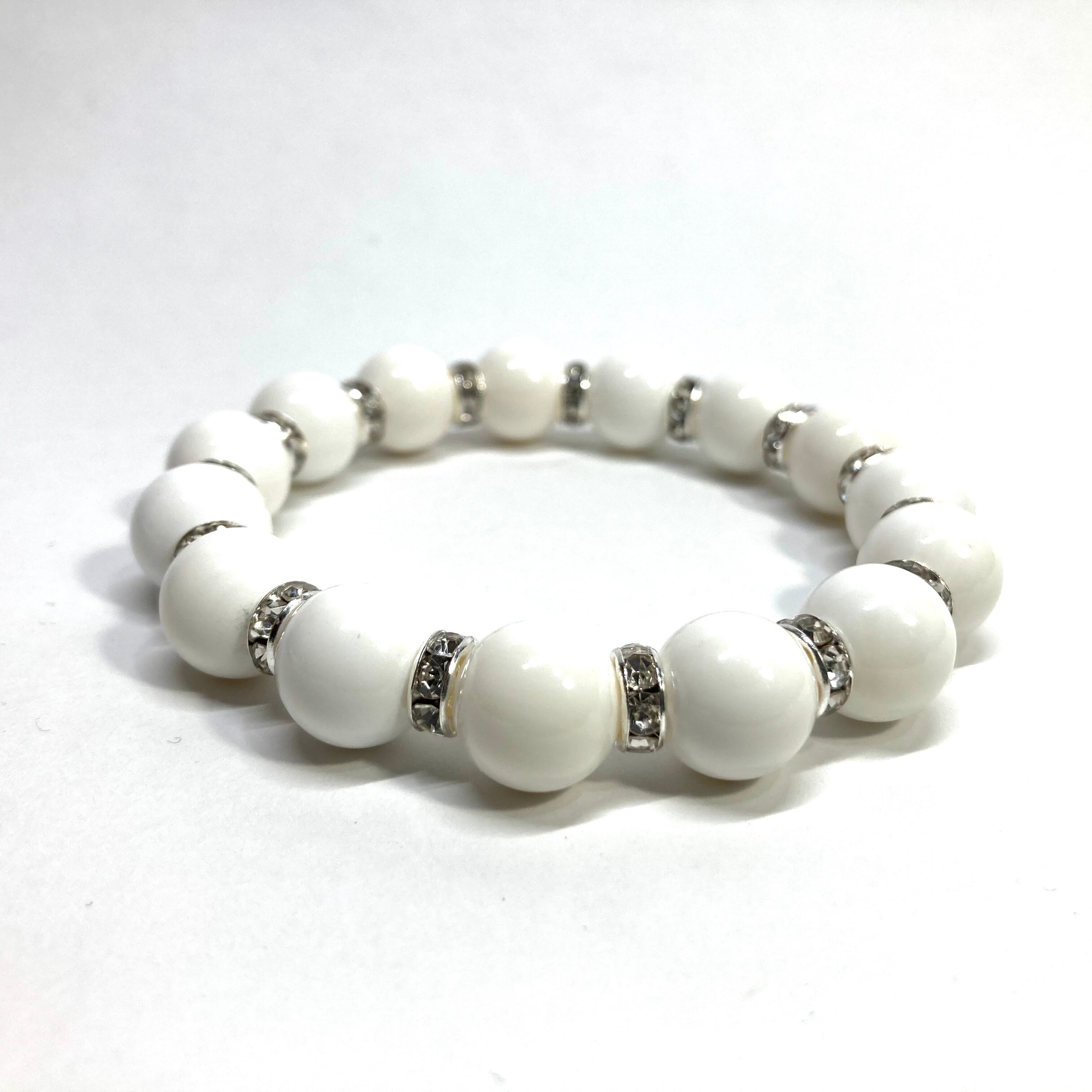こちらは、12mm玉のホワイトオニキスを使用した天然石ブレスレットです。石との間にはロンデルを挟み高級感を演出しています。シンプルなデザインですのでどんなコーディネートとも合わせ易いブレスレットです。石大きさは12mm玉です。内周約18cmです。数に限りがございますので気になる方はお早めにどうぞ。