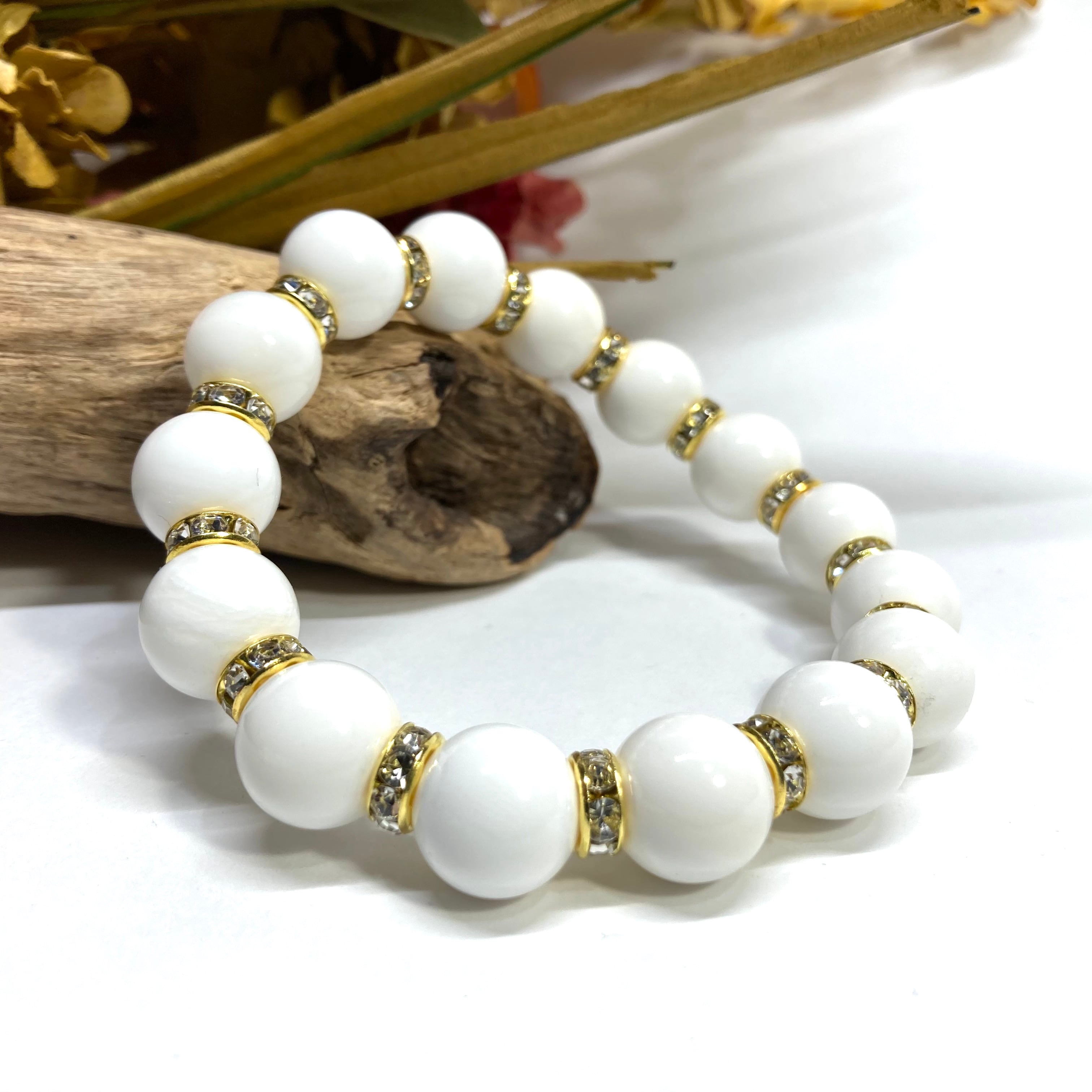 こちらは、12mm玉のホワイトオニキスを使用した天然石ブレスレットです。石との間にはロンデルを挟み高級感を演出しています。シンプルなデザインですのでどんなコーディネートとも合わせ易いブレスレットです。石大きさは12mm玉です。内周約18cmです。数に限りがございますので気になる方はお早めにどうぞ。