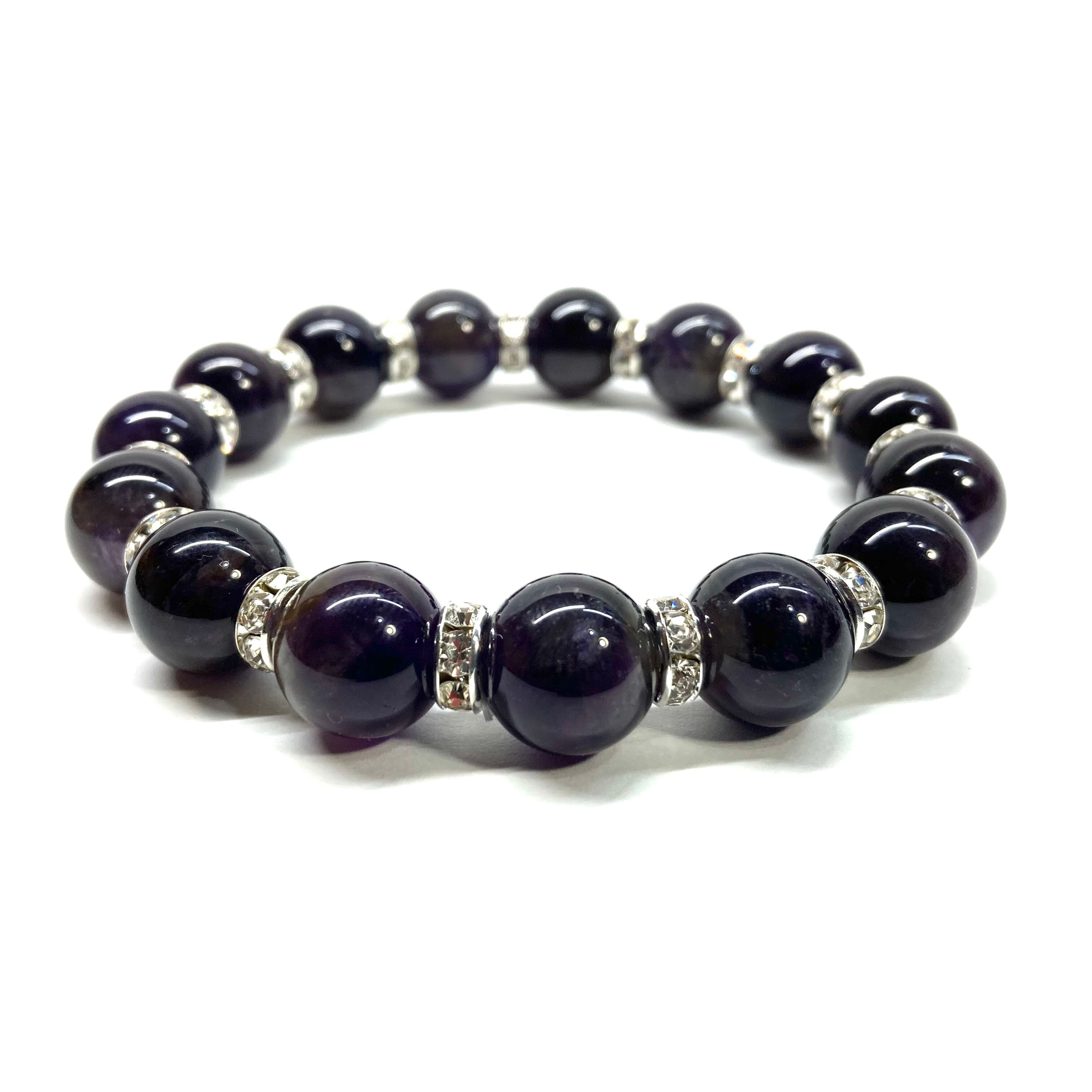 こちらは、10mm玉のアメジストを使用したパワーストーンブレスレットです。間にはロンデルを挟み高級感を演出しております。男女問わずどんなコーディネートとも合わせ易いブレスレットです。サイズは内周約18cmです。数に限りがございますので気になる方はお早めにどうぞ。