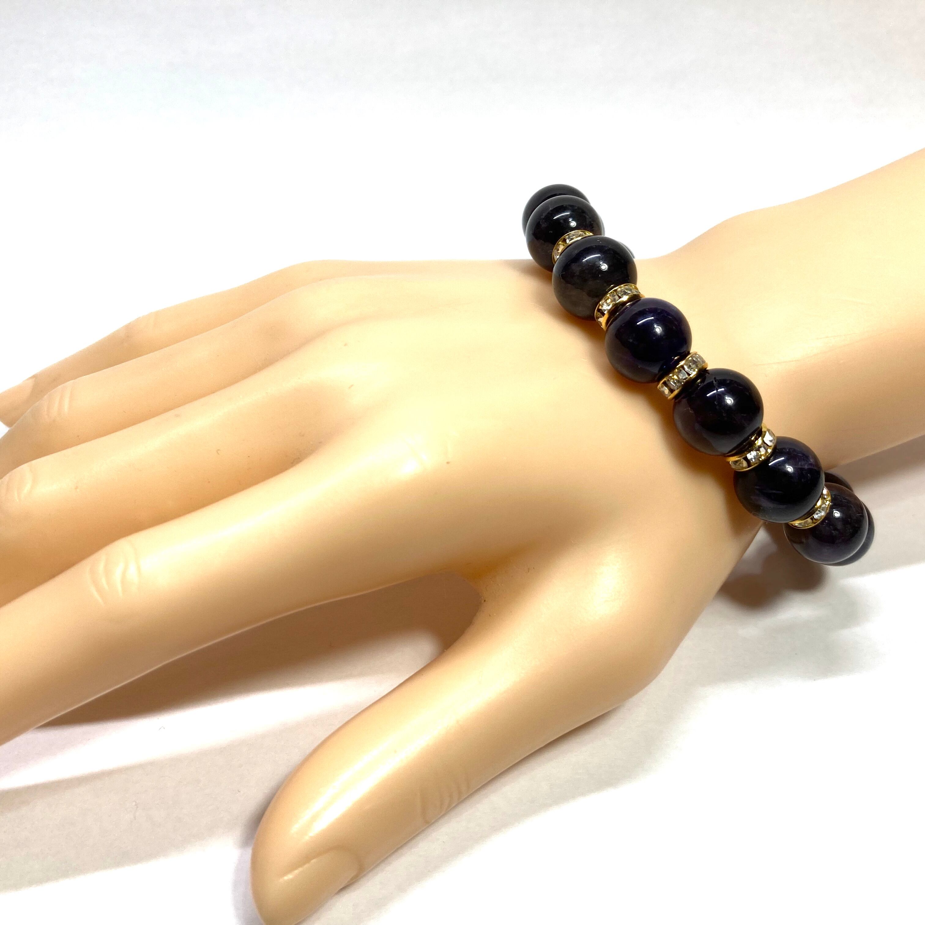 こちらは、10mm玉のアメジストを使用したパワーストーンブレスレットです。間にはロンデルを挟み高級感を演出しております。男女問わずどんなコーディネートとも合わせ易いブレスレットです。サイズは内周約18cmです。数に限りがございますので気になる方はお早めにどうぞ。