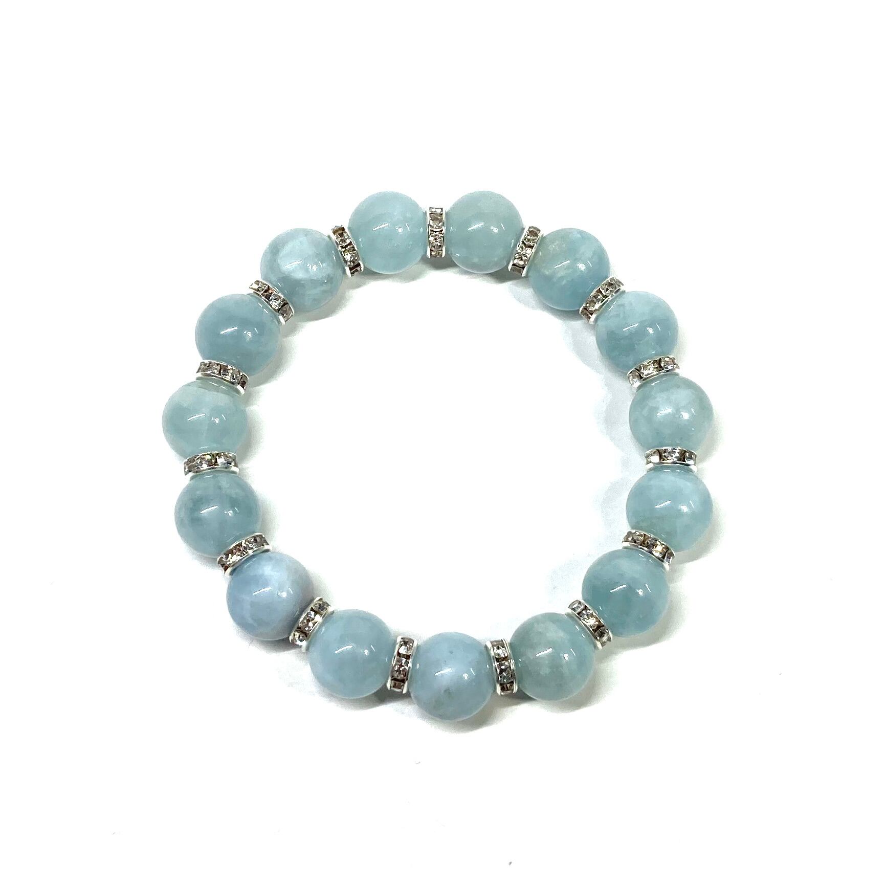 こちらは、12mm玉のアクアマリンを使用したパワーストーンブレスレットです。間にはロンデルを挟み高級感を演出しております。男女問わずどんなコーディネートとも合わせ易いブレスレットです。サイズは内周約18cmです。 数に限りがございますので気になる方はお早めにどうぞ