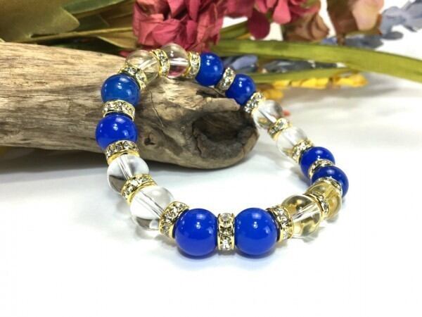 こちらは、ブルーメノウと水晶を組み合わせたブレスレットです。間にはロンデルを挟み高級感あるデザインに仕上がっています。石大きさは腕にも馴染みやすいように10mm玉で内周約16cm(伸可能)です。数に限りがございますので気になる方はお早めにどうぞ。