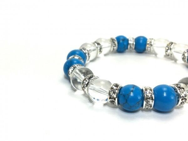 こちらは、ターコイズと水晶を組み合わせたブレスレットです。間にはロンデルを挟み高級感あるデザインに仕上がっています。石大きさは腕にも馴染みやすいように10mm玉で内周約16cm(伸可能)です。数に限りがございますので気になる方はお早めにどうぞ。
