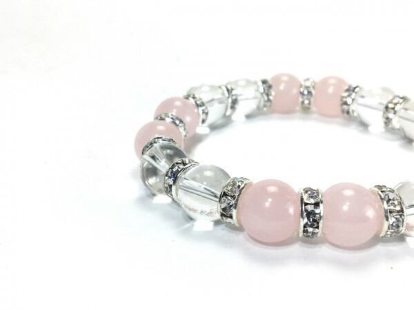 こちらは、ローズクォーツと水晶を組み合わせたブレスレットです。間にはロンデルを挟み高級感あるデザインに仕上がっています。石大きさは腕にも馴染みやすいように10mm玉で内周約16cm(伸可能)です。数に限りがございますので気になる方はお早めにどうぞ。