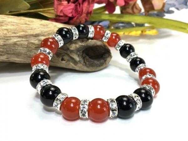 こちらは、赤瑪瑙とオニキスを組み合わせたブレスレットです。間にはロンデルを挟み高級感あるデザインに仕上がっています。石大きさは腕にも馴染みやすいように10mm玉で内周約16cm(伸可能)です。数に限りがございますので気になる方はお早めにどうぞ。