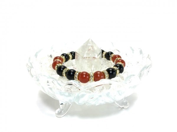 こちらは、赤瑪瑙とオニキスを組み合わせたブレスレットです。間にはロンデルを挟み高級感あるデザインに仕上がっています。石大きさは腕にも馴染みやすいように10mm玉で内周約16cm(伸可能)です。数に限りがございますので気になる方はお早めにどうぞ。