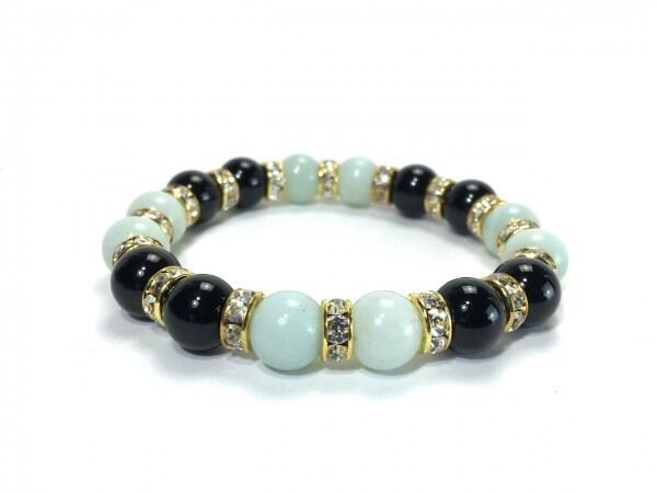こちらは、アマゾナイトとオニキスを組み合わせたブレスレットです。間にはロンデルを挟み高級感あるデザインに仕上がっています。石大きさは腕にも馴染みやすいように10mm玉で内周約16cm(伸可能)です。数に限りがございますので気になる方はお早めにどうぞ。
