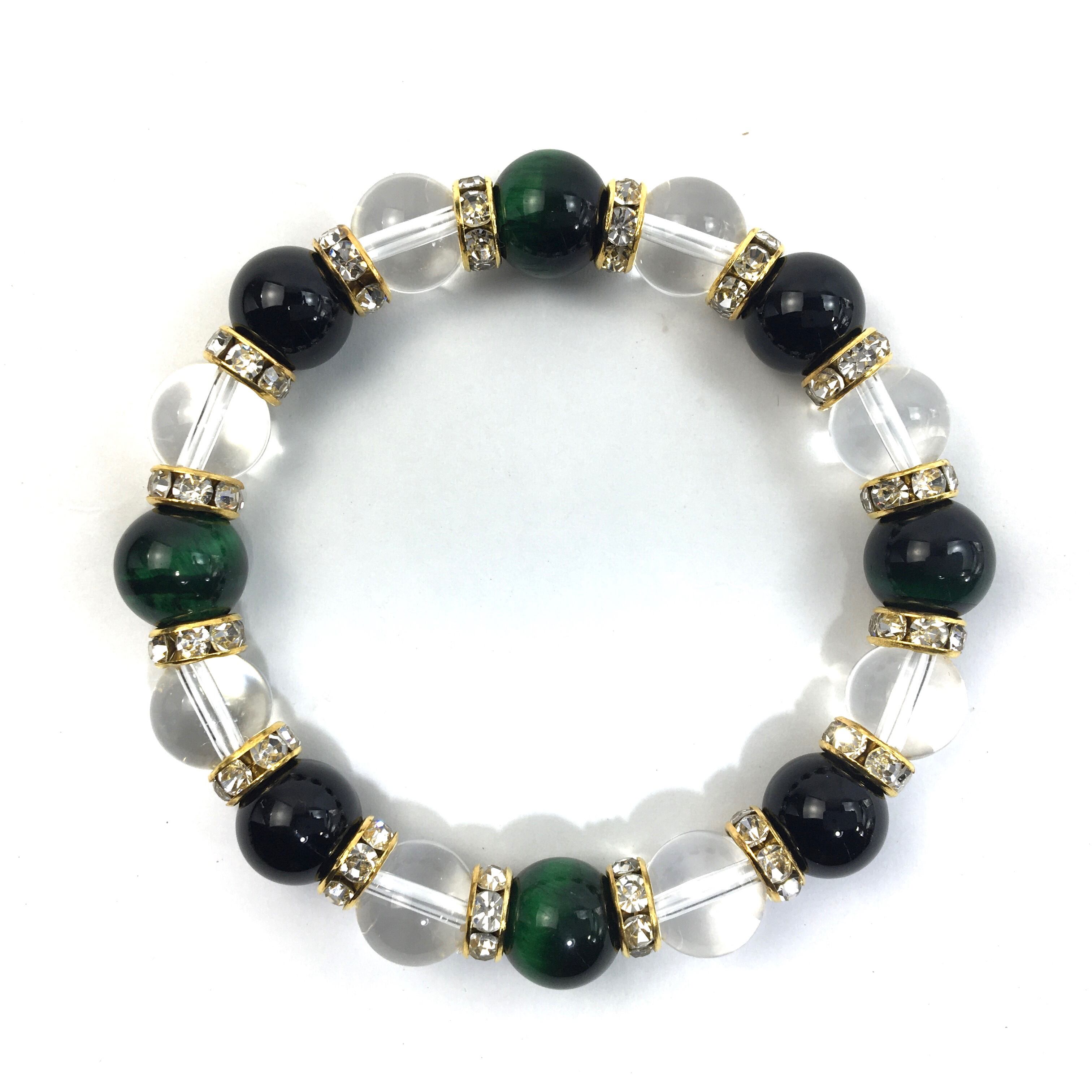 グリーンタイガーアイ×水晶×オニキス パワーストーン ブレスレット 10mm(ゴールド)メンズ・レディース 男性・女性 数珠ブレス 開運 ☆
