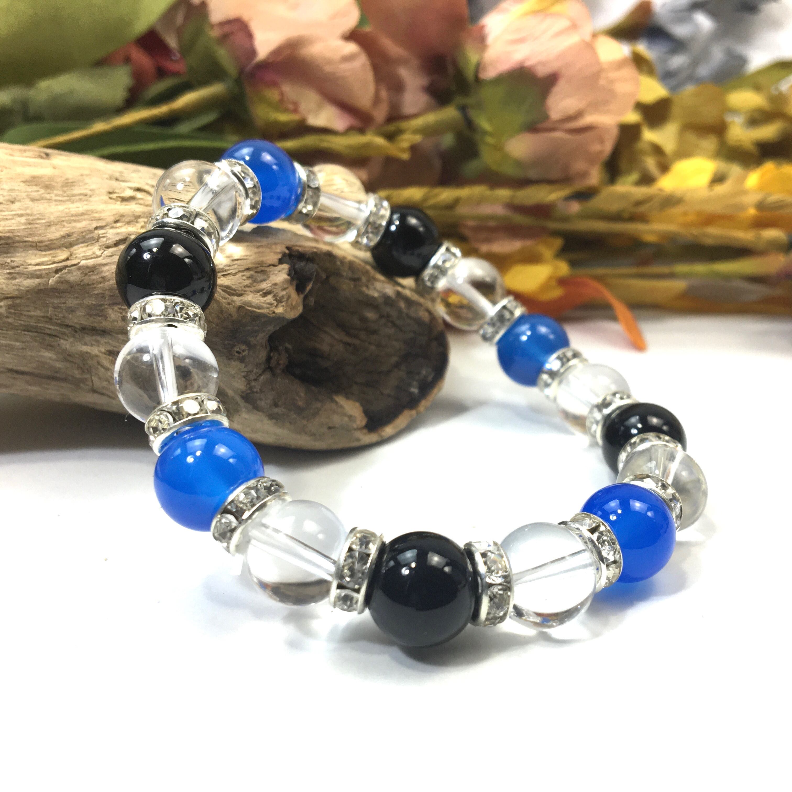 こちらは、ブルーメノウと水晶とオニキスを組み合わせたブレスレットです。間にはロンデルを挟み高級感あるデザインに仕上がっています。石大きさは腕にも馴染みやすいように10mm玉で内周約16cmです。数に限りがございますので気になる方はお早めにどうぞ。