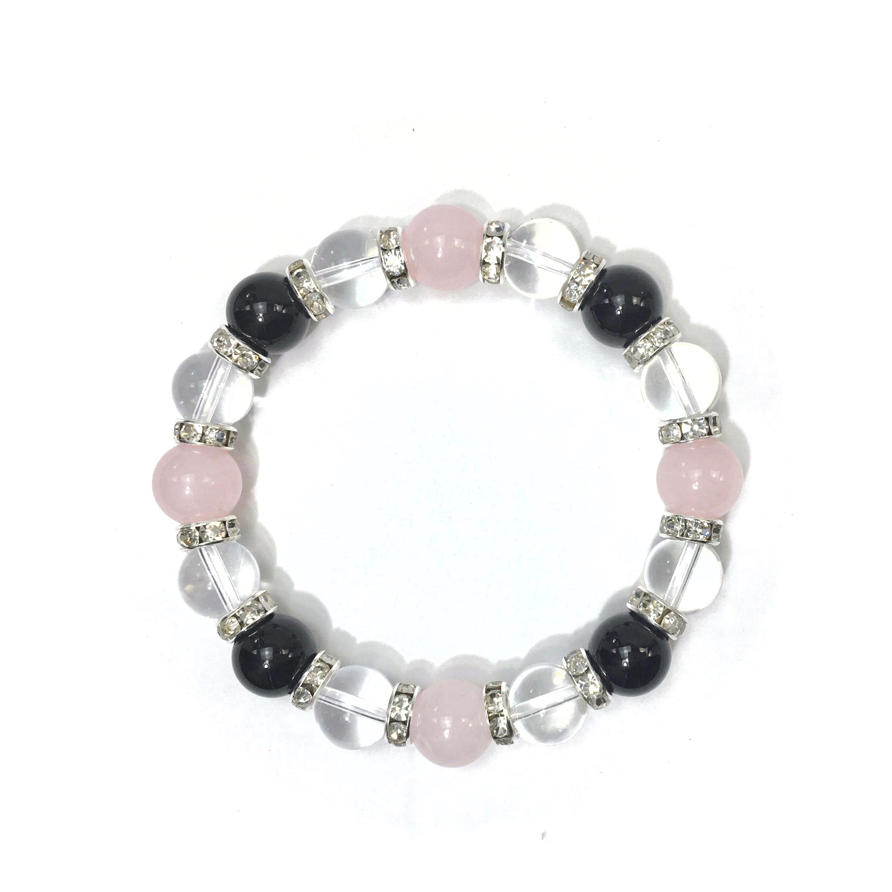こちらは、ローズクォーツと水晶とオニキスを組み合わせたブレスレットです。間にはロンデルを挟み高級感あるデザインに仕上がっています。石大きさは腕にも馴染みやすいように10mm玉で内周約16cmです。数に限りがございますので気になる方はお早めにどうぞ。