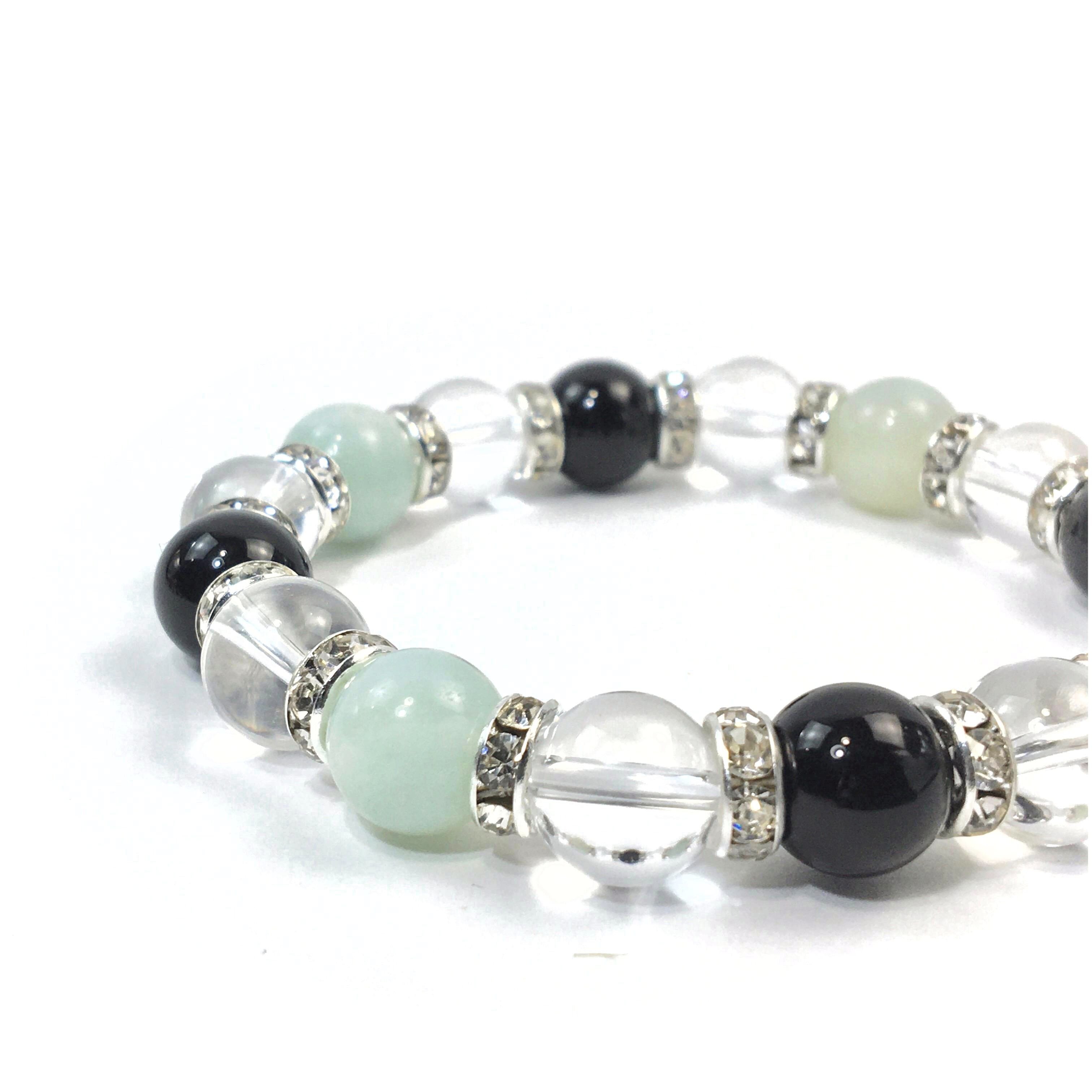 こちらは、アマゾナイトと水晶とオニキスを組み合わせたブレスレットです。間にはロンデルを挟み高級感あるデザインに仕上がっています。石大きさは腕にも馴染みやすいように10mm玉で内周約16cmです。数に限りがございますので気になる方はお早めにどうぞ。