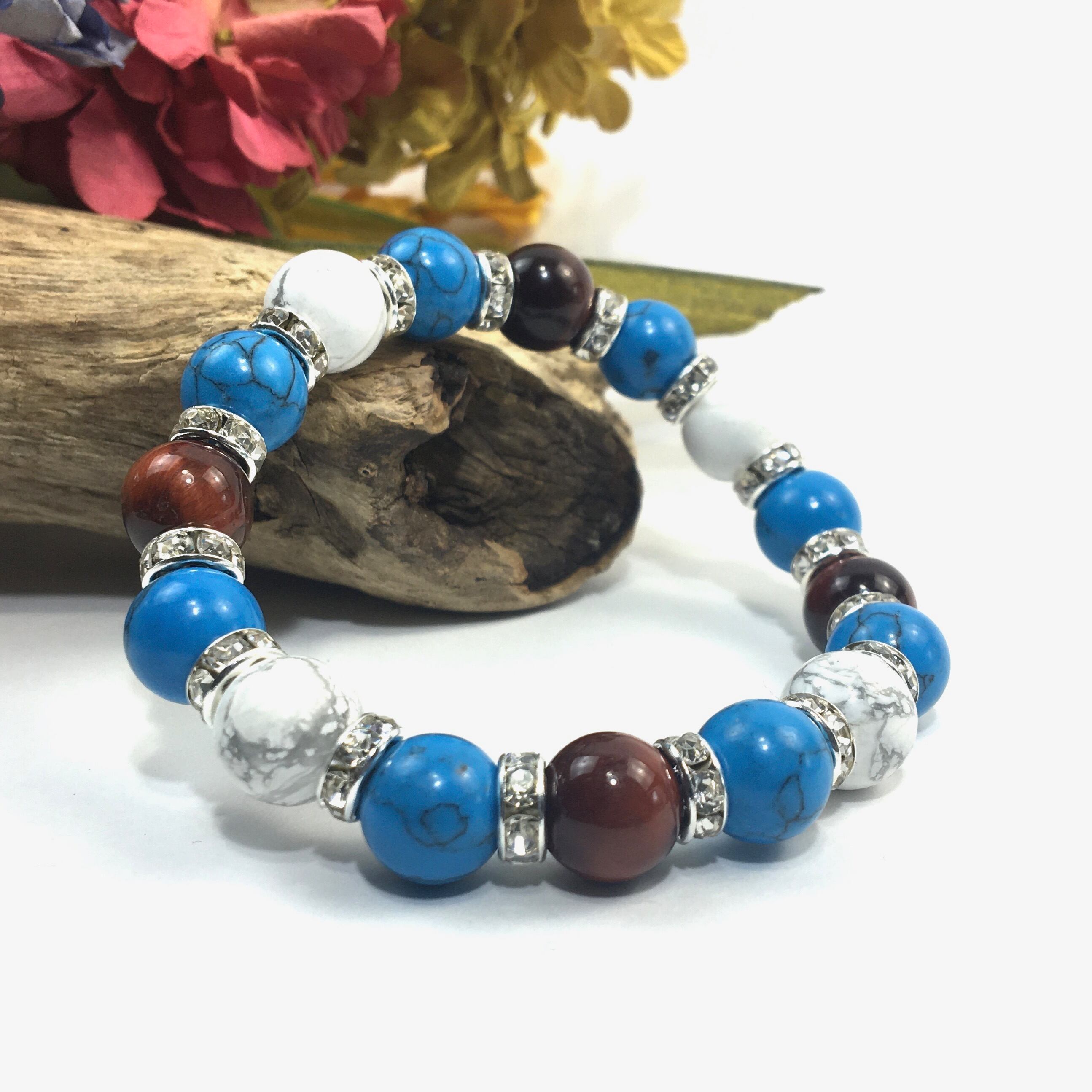 こちらは、レッドタイガーアイとハウライトとターコイズを組み合わせたブレスレットです。間にはロンデルを挟み高級感あるデザインに仕上がっています。石大きさは腕にも馴染みやすいように10mm玉で内周約16cmです。数に限りがございますので気になる方はお早めにどうぞ。