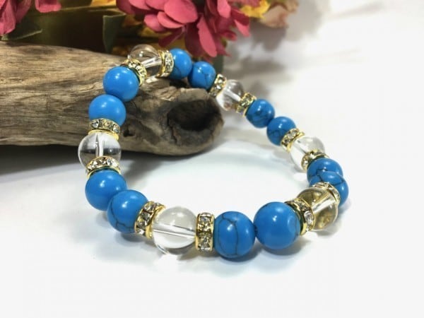 こちらは、ターコイズと水晶を組み合わせたブレスレットです。間にはロンデルを挟み高級感あるデザインに仕上がっています。石大きさは腕にも馴染みやすいように10mm玉で内周約17cm(伸可能)です。数に限りがございますので気になる方はお早めにどうぞ。