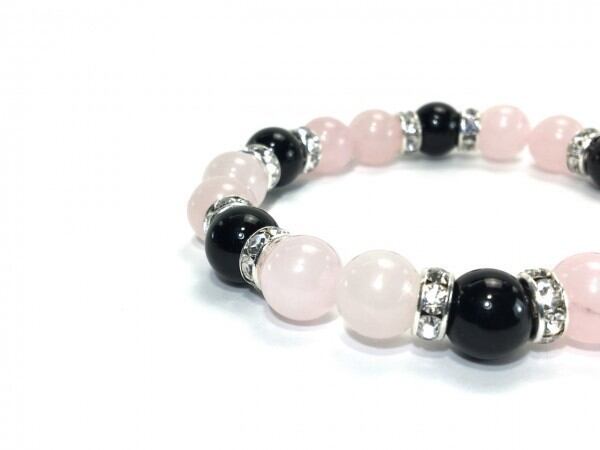 こちらは、ローズクォーツとオニキスを組み合わせたブレスレットです。間にはロンデルを挟み高級感あるデザインに仕上がっています。石大きさは腕にも馴染みやすいように10mm玉で内周約17cm(伸可能)です。数に限りがございますので気になる方はお早めにどうぞ。