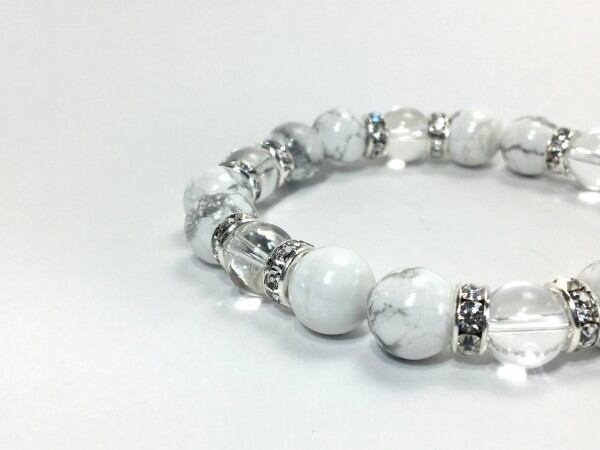 こちらは、ハウライトと水晶を組み合わせたブレスレットです。間にはロンデルを挟み高級感あるデザインに仕上がっています。石大きさは腕にも馴染みやすいように10mm玉で内周約17cm(伸可能)です。数に限りがございますので気になる方はお早めにどうぞ。