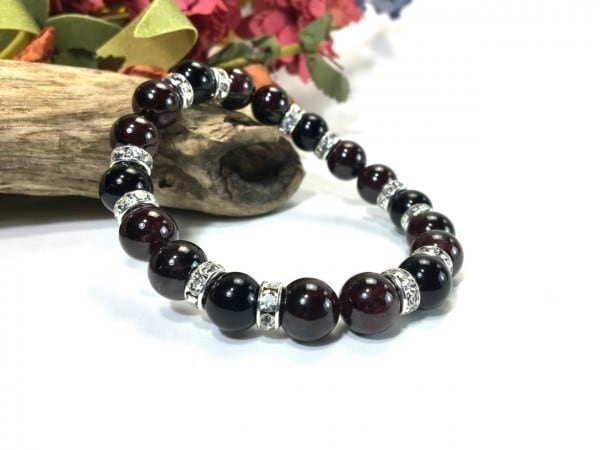 こちらは、ガーネットとオニキスを組み合わせたブレスレットです。間にはロンデルを挟み高級感あるデザインに仕上がっています。石大きさは腕にも馴染みやすいように10mm玉で内周約17cm(伸可能)です。数に限りがございますので気になる方はお早めにどうぞ。