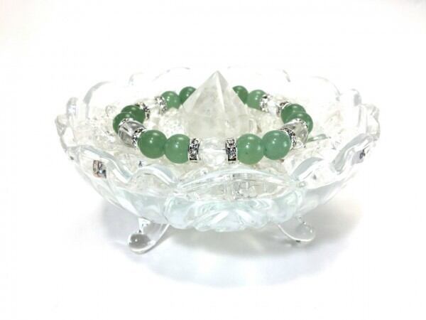こちらは、アベンチュリンと水晶を組み合わせたブレスレットです。間にはロンデルを挟み高級感あるデザインに仕上がっています。石大きさは腕にも馴染みやすいように10mm玉で内周約17cm(伸可能)です。数に限りがございますので気になる方はお早めにどうぞ。