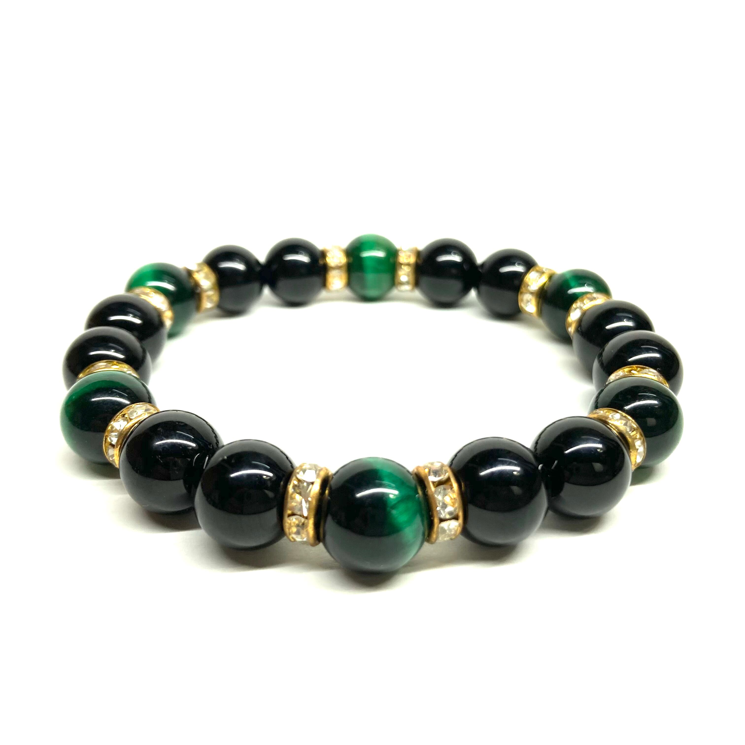 こちらは、モリオンとグリーンタイガーアイを組み合わせたパワーストーンブレスレットです。間にはロンデルを挟み高級感あるデザインに仕上げております。石大きさは腕にも馴染みやすいように10mm玉で内径約18cm(伸可能)です。 数に限りがございますので気になる方はお早めにどうぞ。