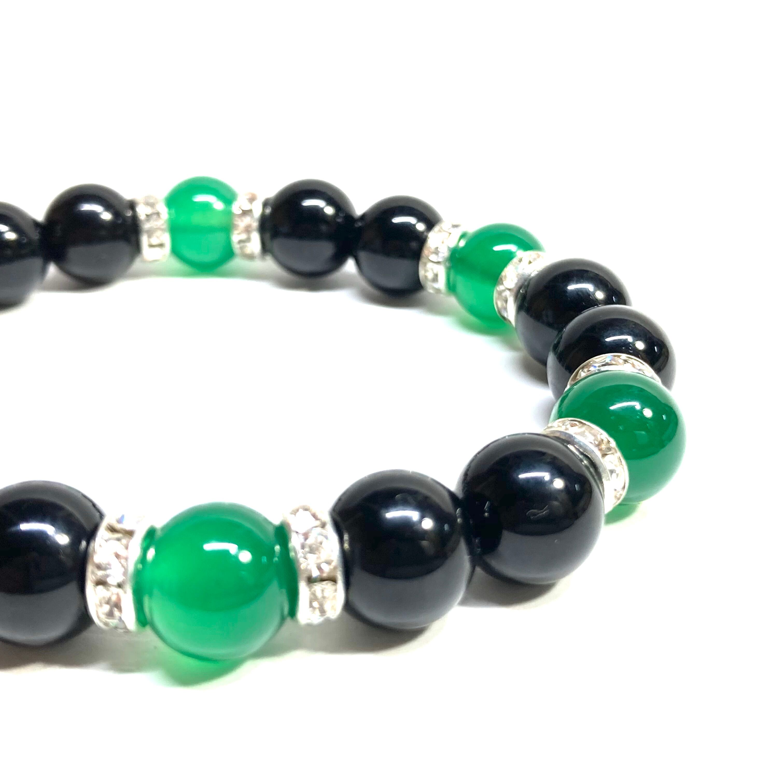 こちらは、モリオンと緑瑪瑙を組み合わせたパワーストーンブレスレットです。間にはロンデルを挟み高級感あるデザインに仕上げております。石大きさは腕にも馴染みやすいように10mm玉で内径約18cm(伸可能)です。 数に限りがございますので気になる方はお早めにどうぞ。