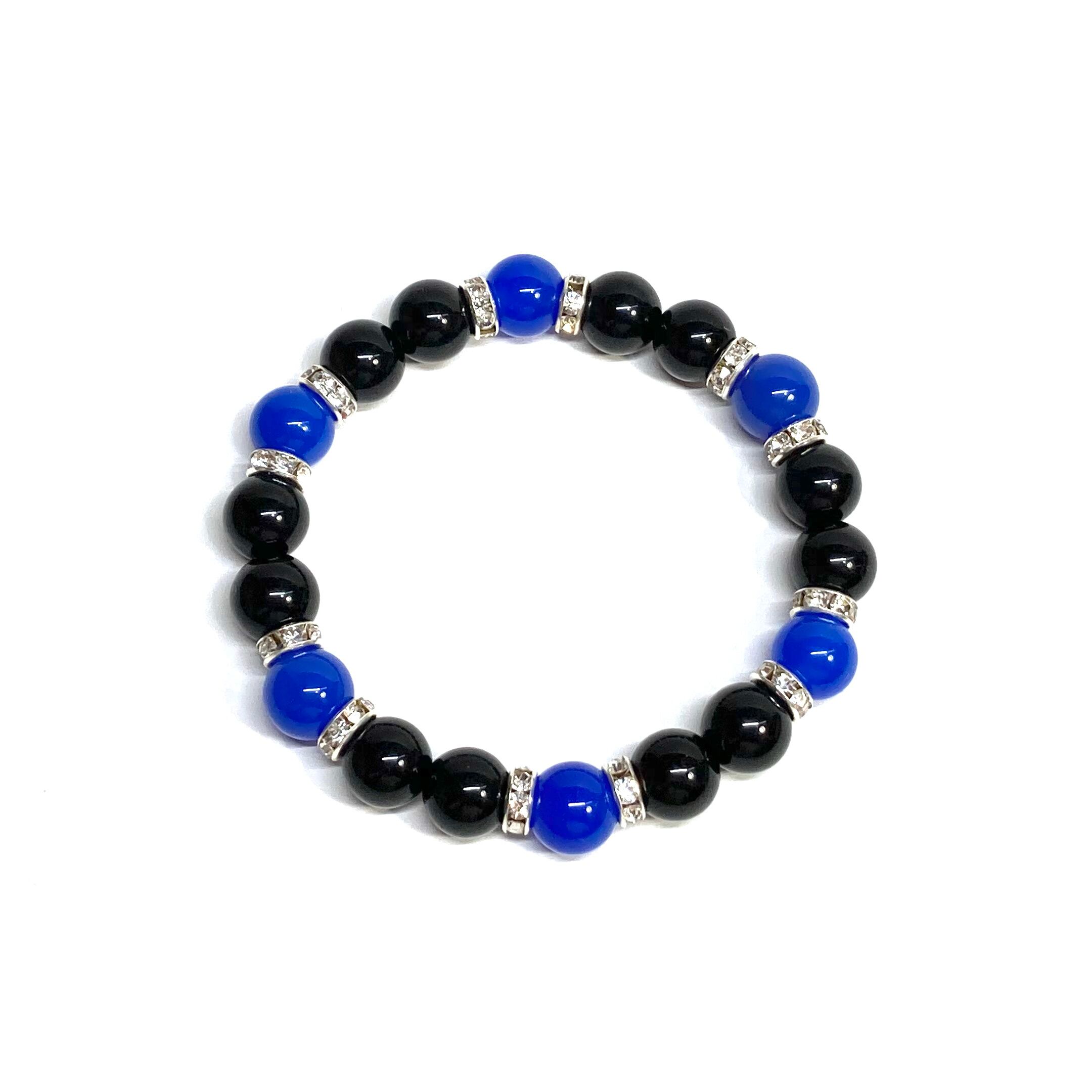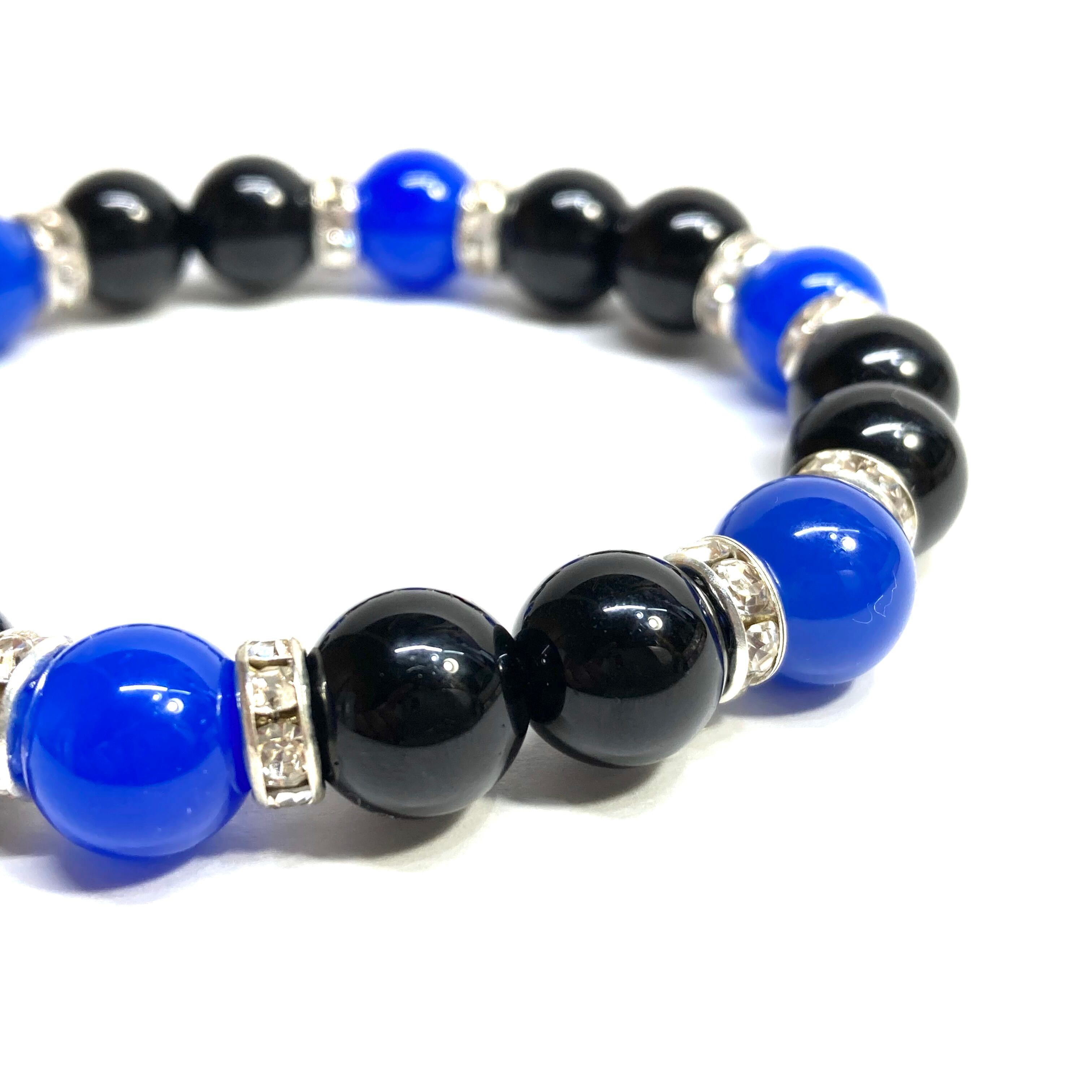 こちらは、モリオンと青瑪瑙を組み合わせたパワーストーンブレスレットです。間にはロンデルを挟み高級感あるデザインに仕上げております。石大きさは腕にも馴染みやすいように10mm玉で内径約18cm(伸可能)です。 数に限りがございますので気になる方はお早めにどうぞ。