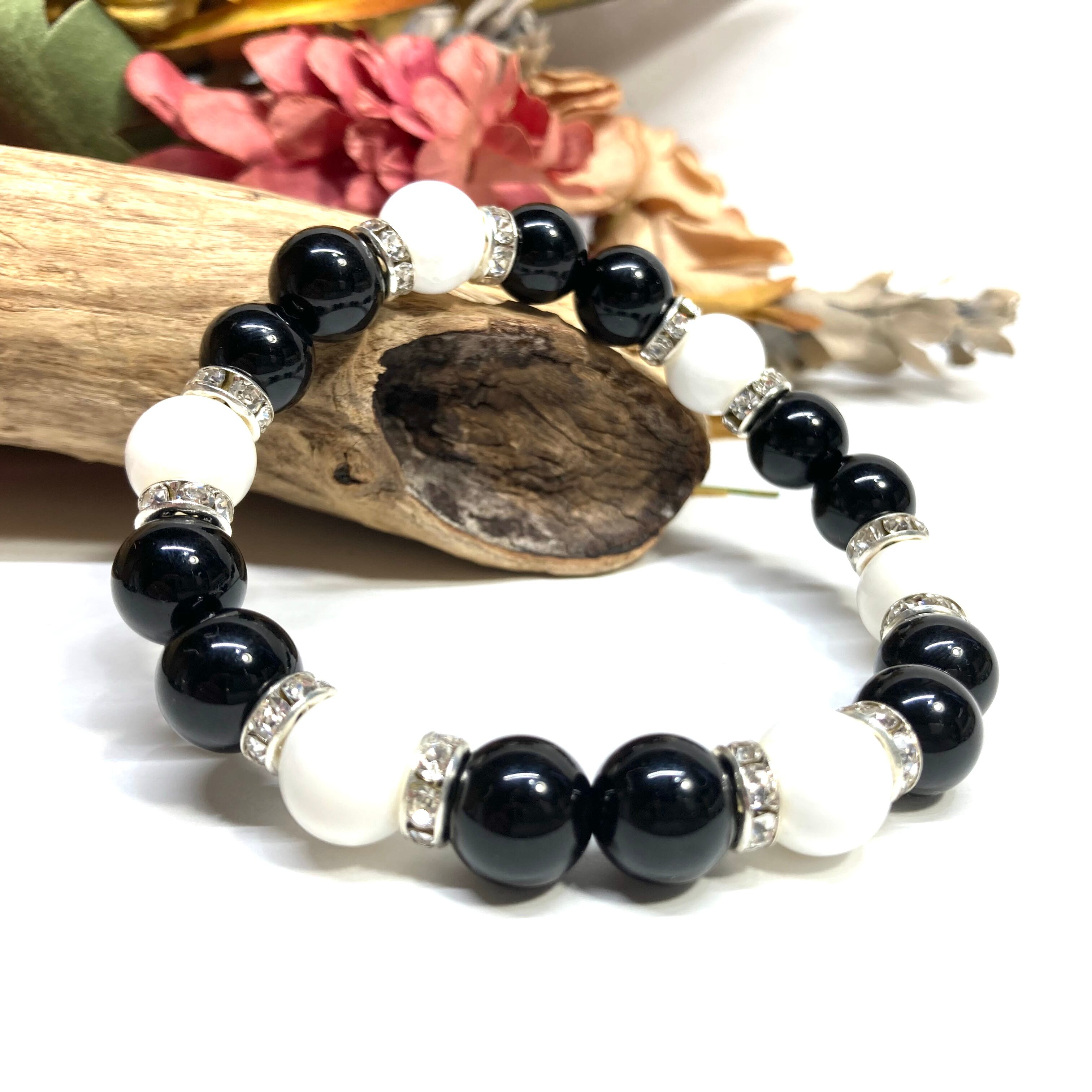 こちらは、モリオンとホワイトオニキスを組み合わせたパワーストーンブレスレットです。間にはロンデルを挟み高級感あるデザインに仕上げております。石大きさは腕にも馴染みやすいように10mm玉で内径約18cm(伸可能)です。 数に限りがございますので気になる方はお早めにどうぞ。