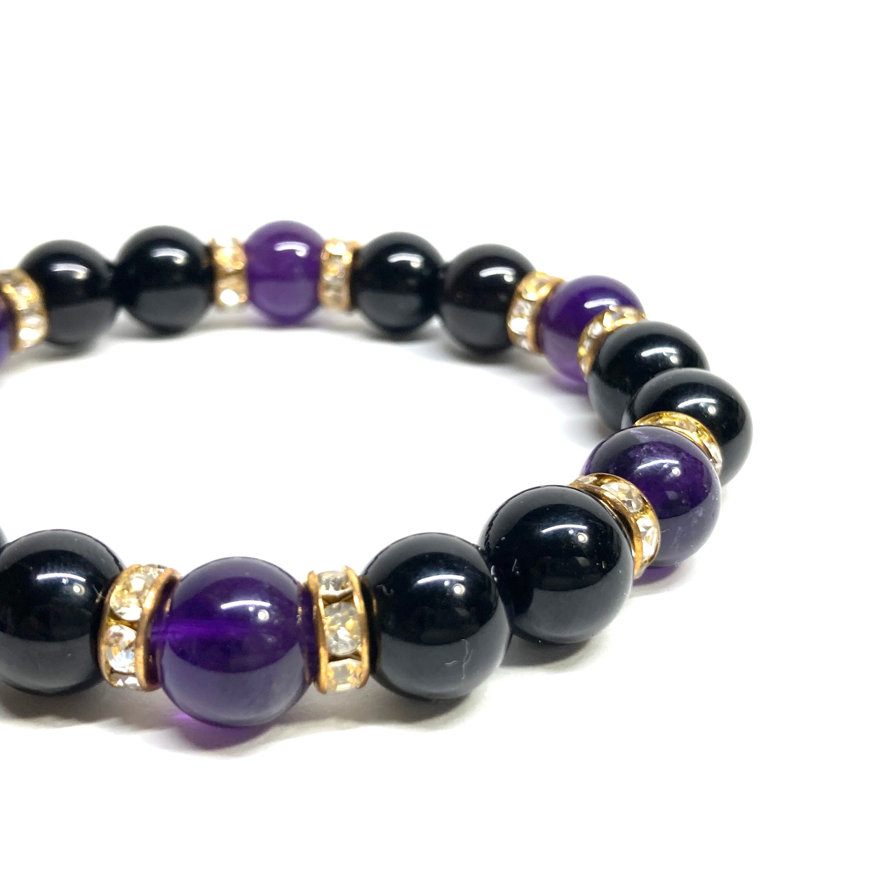 こちらは、モリオンとアメジストを組み合わせたパワーストーンブレスレットです。間にはロンデルを挟み高級感あるデザインに仕上げております。石大きさは腕にも馴染みやすいように10mm玉で内径約18cm(伸可能)です。 数に限りがございますので気になる方はお早めにどうぞ。