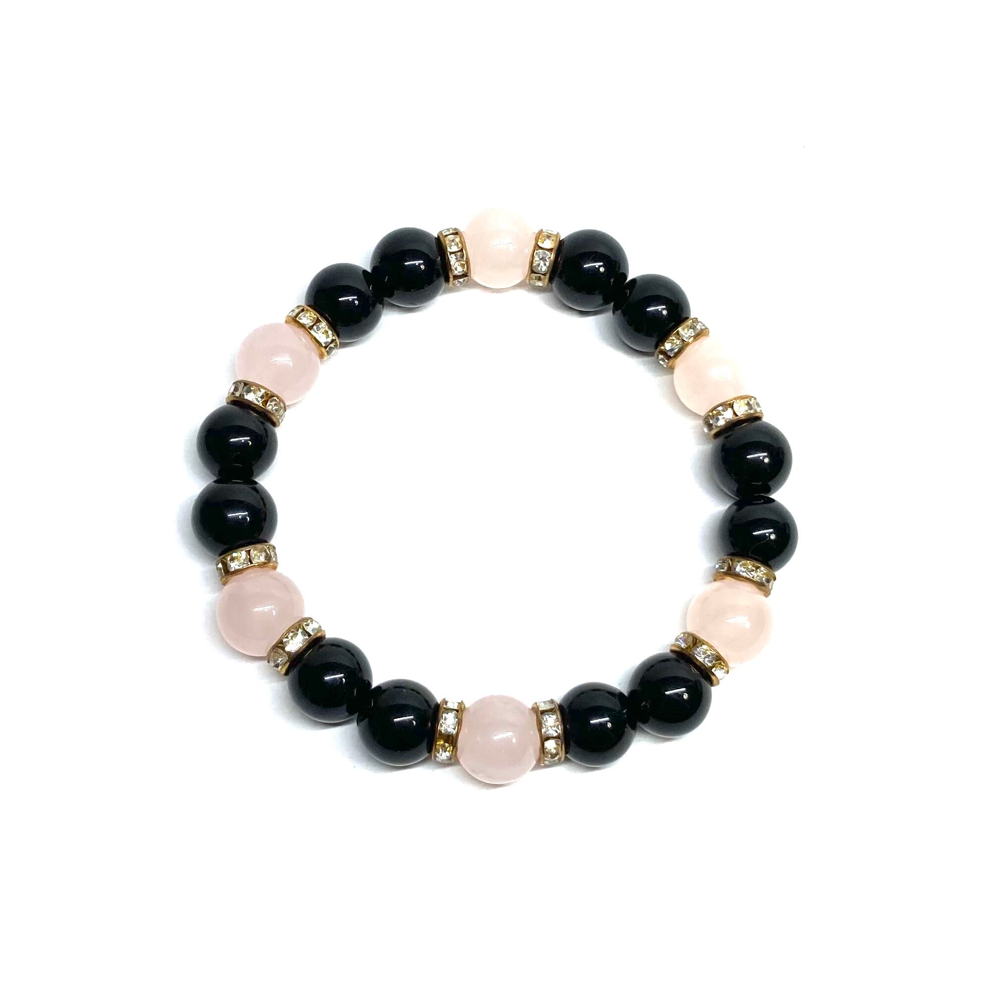 こちらは、モリオンとローズクォーツを組み合わせたパワーストーンブレスレットです。間にはロンデルを挟み高級感あるデザインに仕上げております。石大きさは腕にも馴染みやすいように10mm玉で内径約18cm(伸可能)です。 数に限りがございますので気になる方はお早めにどうぞ。