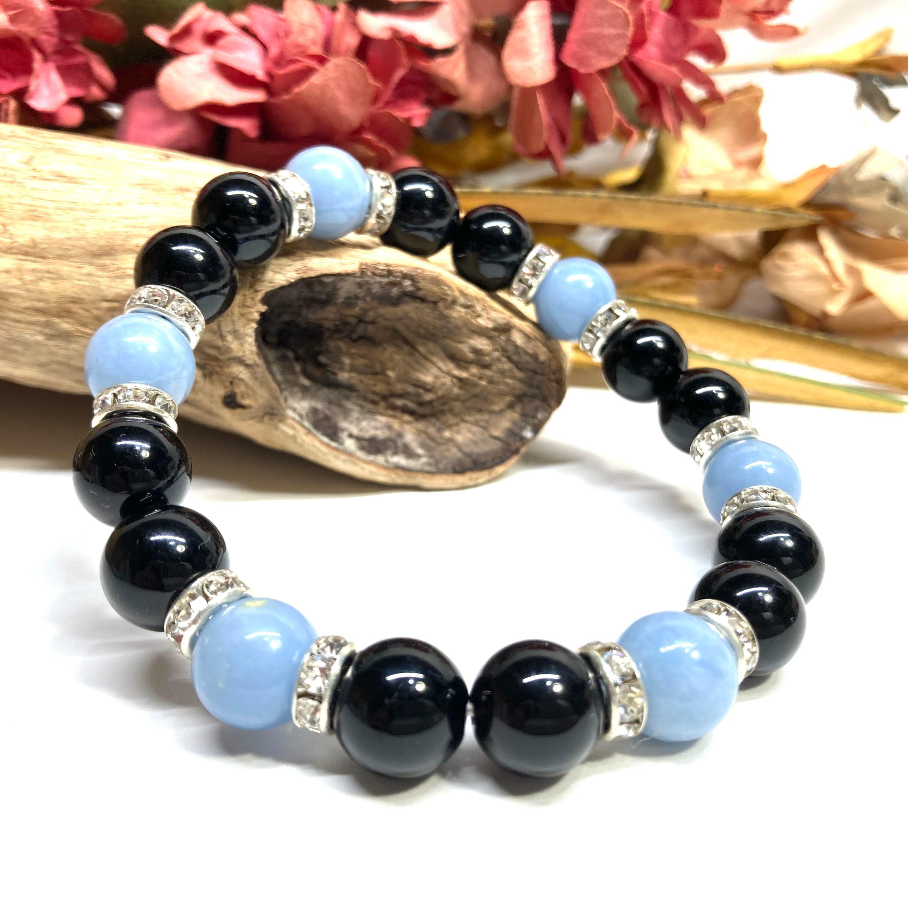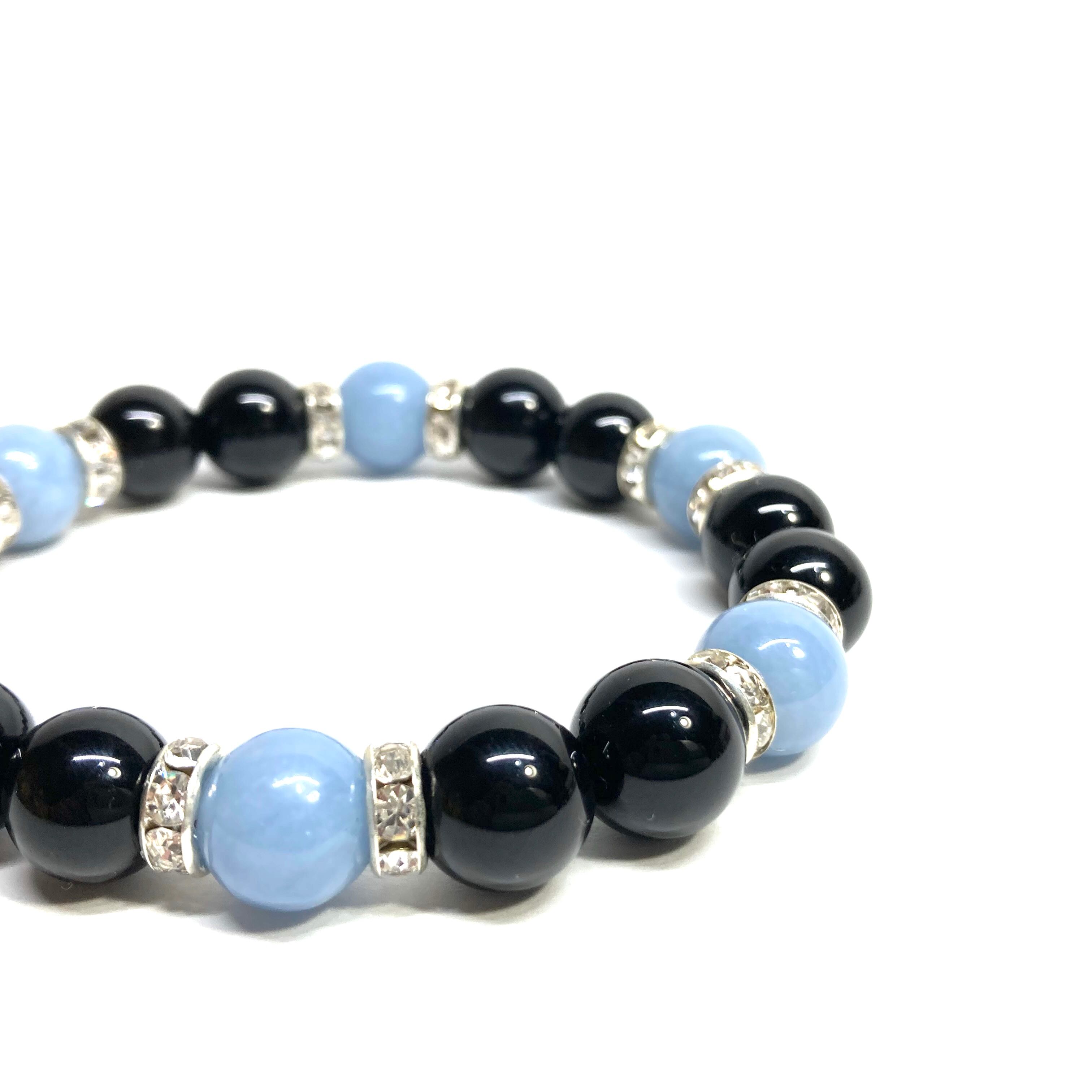 こちらは、モリオンとエンジェライトを組み合わせたパワーストーンブレスレットです。間にはロンデルを挟み高級感あるデザインに仕上げております。石大きさは腕にも馴染みやすいように10mm玉で内径約18cm(伸可能)です。 数に限りがございますので気になる方はお早めにどうぞ。