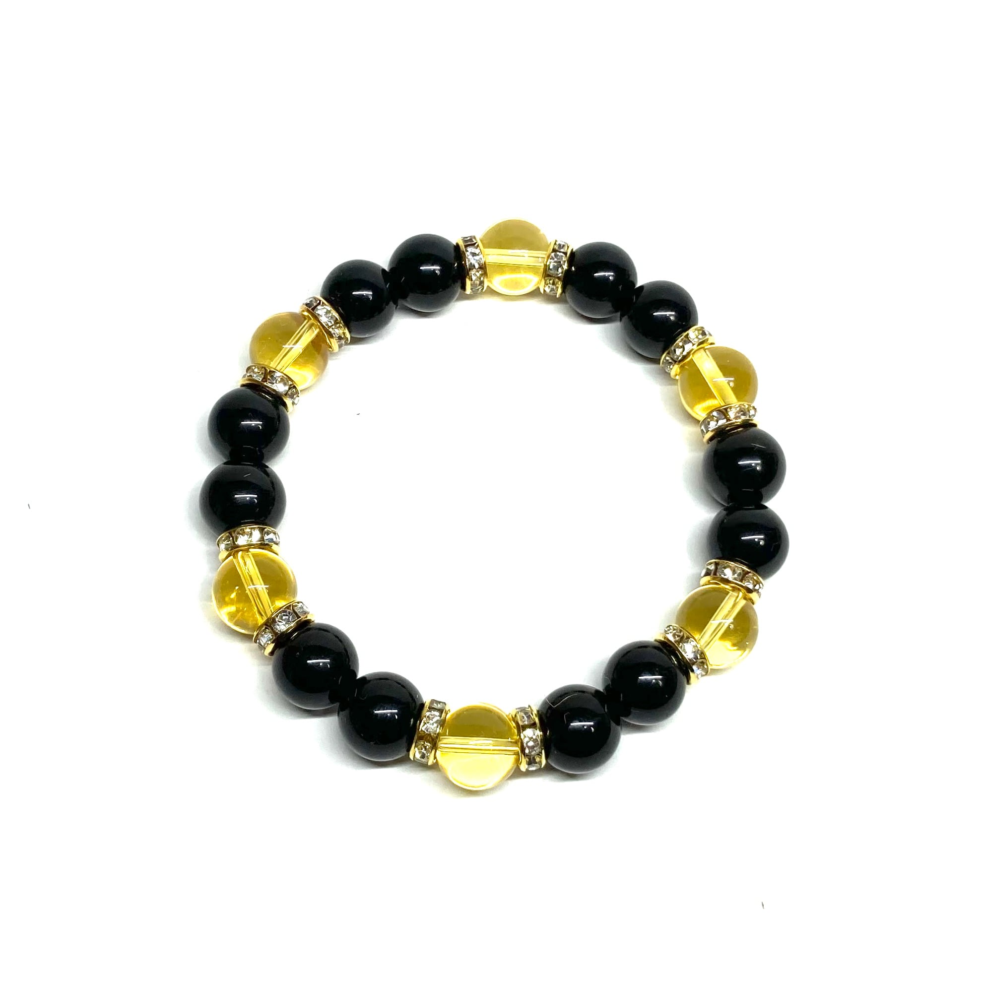 こちらは、モリオンとシトリンを組み合わせたパワーストーンブレスレットです。間にはロンデルを挟み高級感あるデザインに仕上げております。石大きさは腕にも馴染みやすいように10mm玉で内径約18cm(伸可能)です。 数に限りがございますので気になる方はお早めにどうぞ。