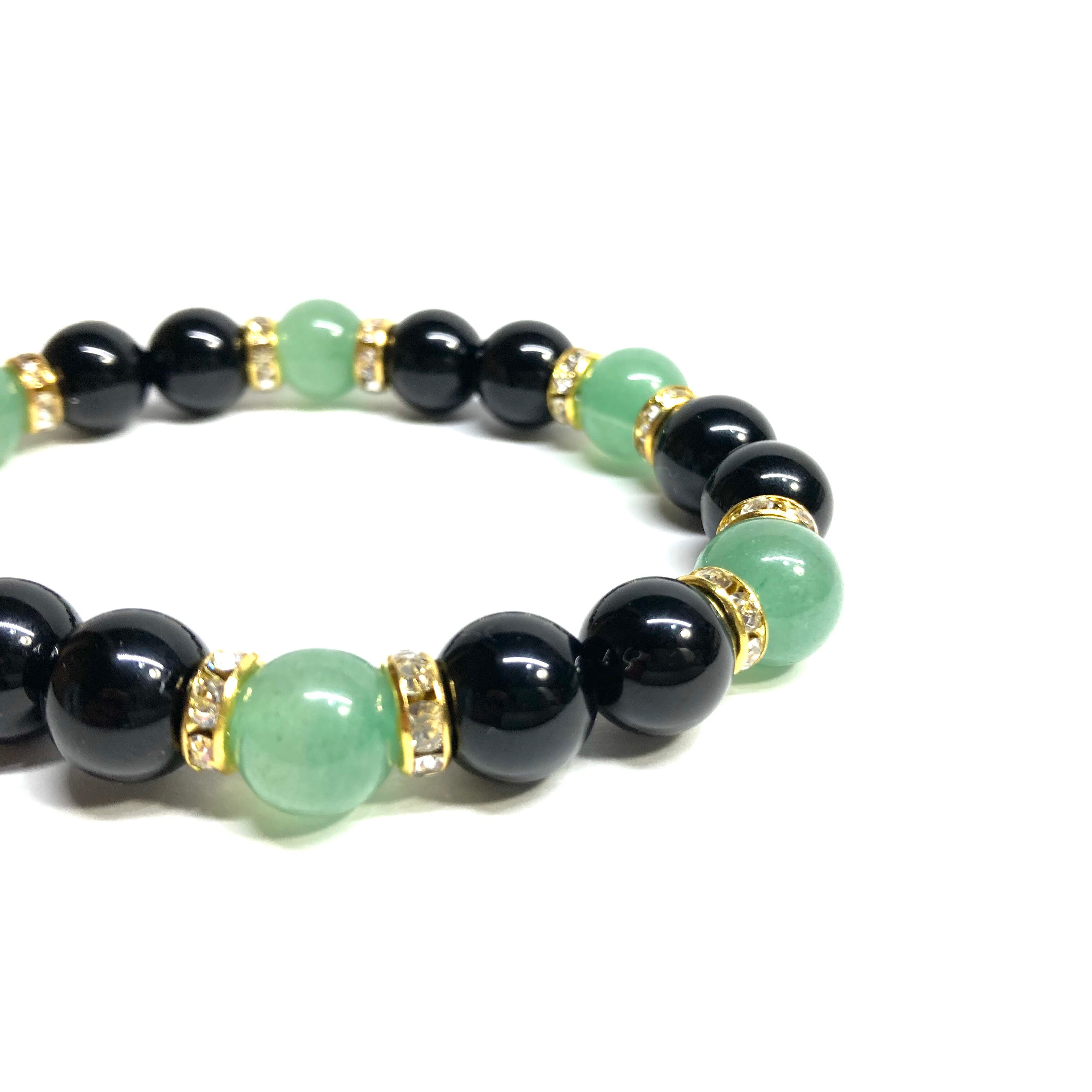 こちらは、モリオンとアベンチュリンを組み合わせたパワーストーンブレスレットです。間にはロンデルを挟み高級感あるデザインに仕上げております。石大きさは腕にも馴染みやすいように10mm玉で内径約18cm(伸可能)です。 数に限りがございますので気になる方はお早めにどうぞ。